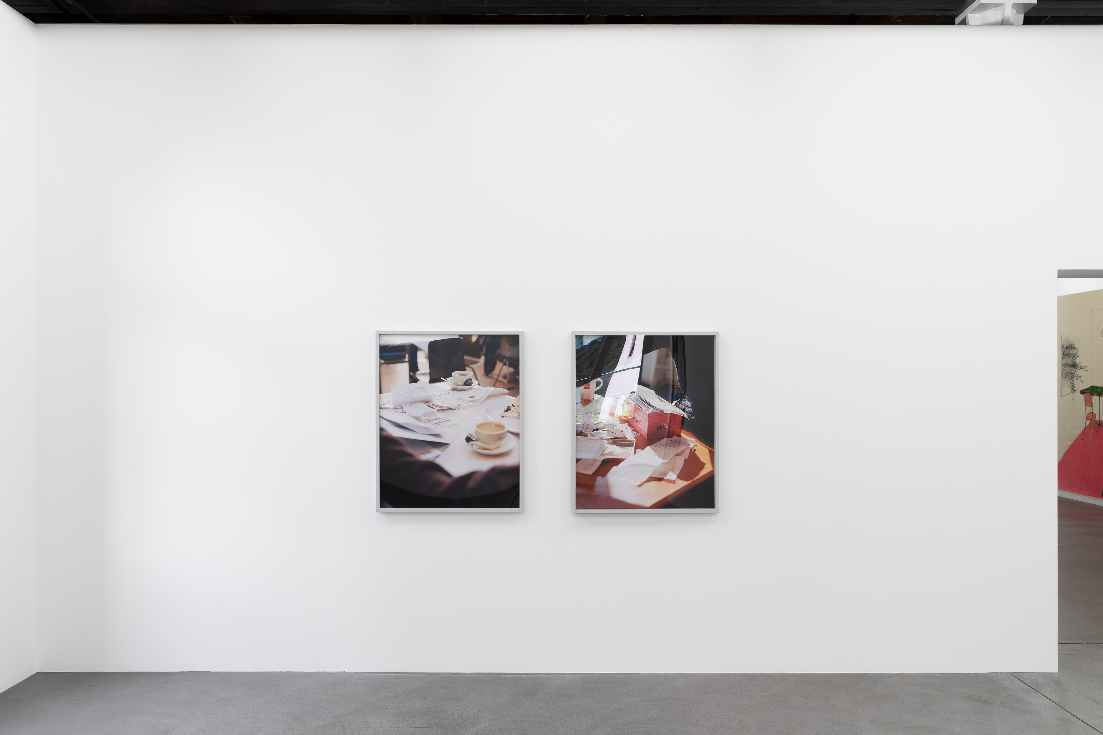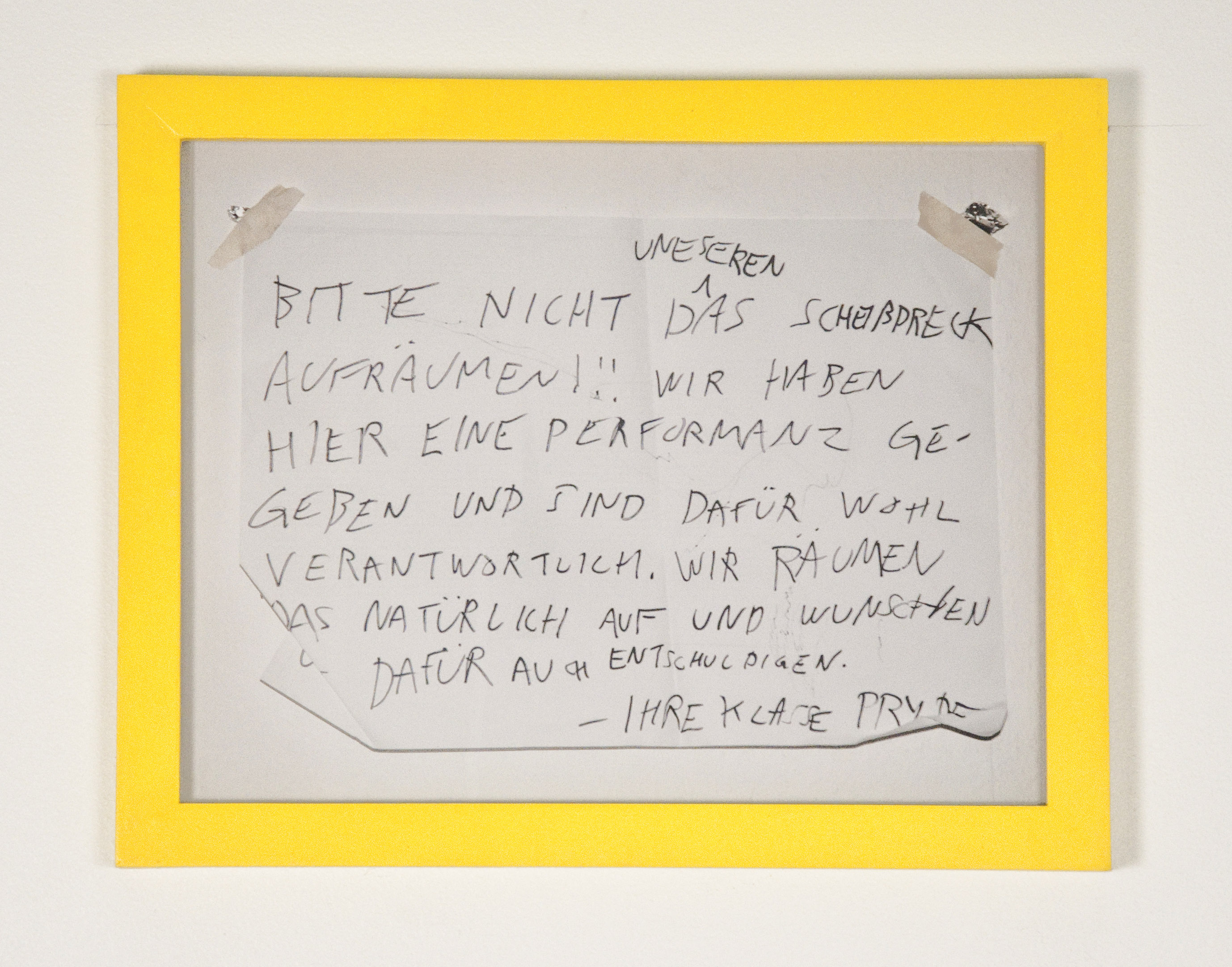 Calla Henkel and Max Pitegoff started their collaboration as undergraduate students at The Cooper Union, a small private Lower Manhattan university specializing in engineering, architecture, and fine arts. One of their earliest works in the exhibition, FUKNAB, 2010, included a number of choreographed performances that tested, in the campiest fashion, the architectural boundaries of the university’s hugely expensive New Academic Building (i.e. the NAB part of the FUKNAB equation). As a direct result of this urban expansion scheme, along with other poor financial decisions made by the institution’s board, The Cooper Union began to charge admission fees for the first time in its 130 year-old history. The FUKNAB performances involved other students directly impacted by these structural changes, as well as an extended network of friends living in the city. Simultaneously to these scored communal events, Calla Henkel and Max Pitegoff began to develop a body of photographic works. The earliest of these pictures in the show in Fri Art Kunsthalle (Scheißdreck,2010) was taken after one of their performances at Berlin’s Universität der Künste, which Henkel attended as an exchange student, and which Max Pitegoff crashed, alongside half–a–dozen artists enrolled in various programs of different schools. The photo is of a note written in broken German by Mathieu Malouf, a French–Canadian artist, that asks the Universität der Künste’s janitorial staff to not clean up the mess they had left behind.