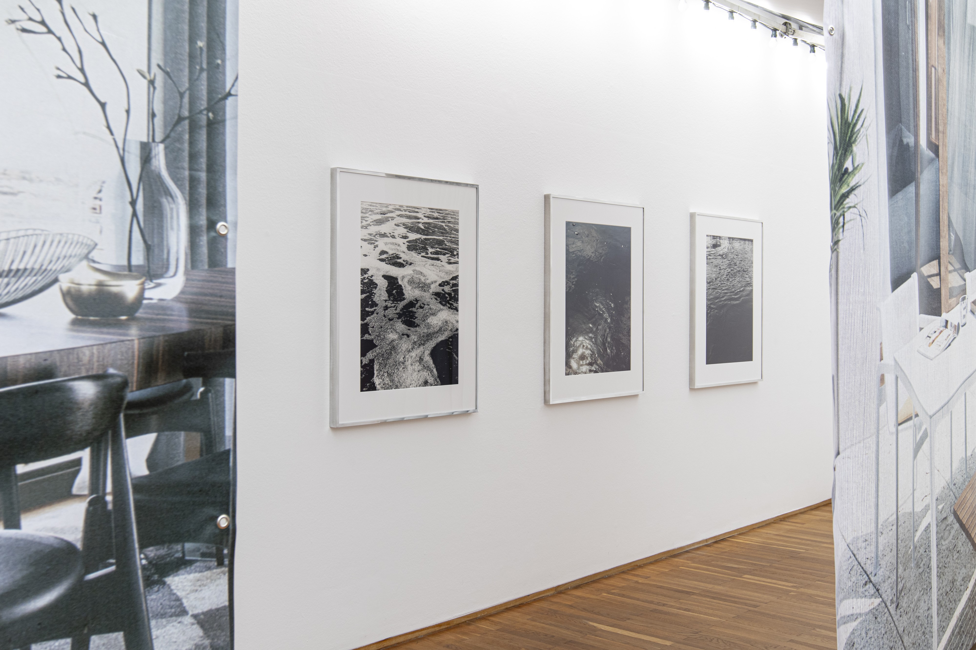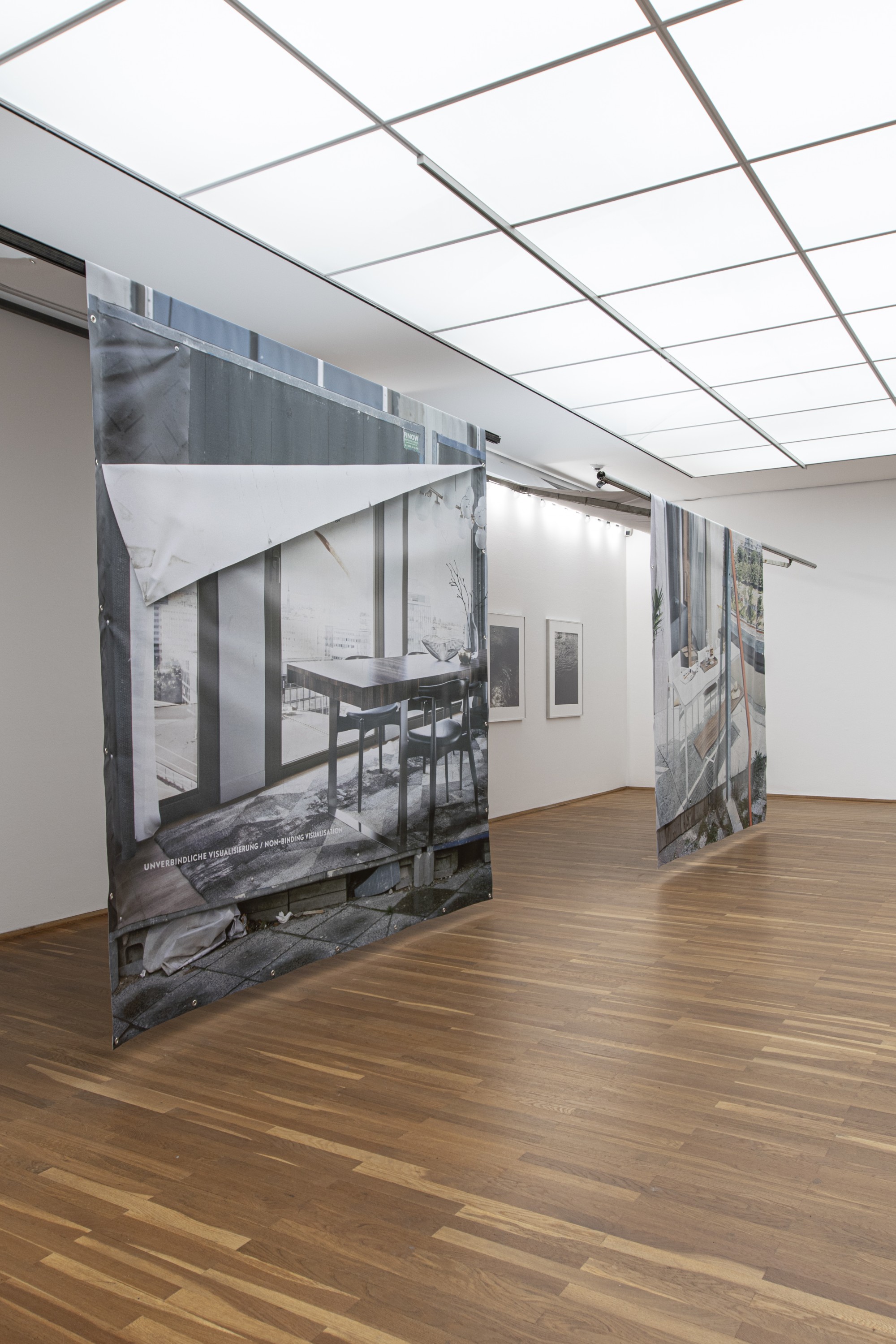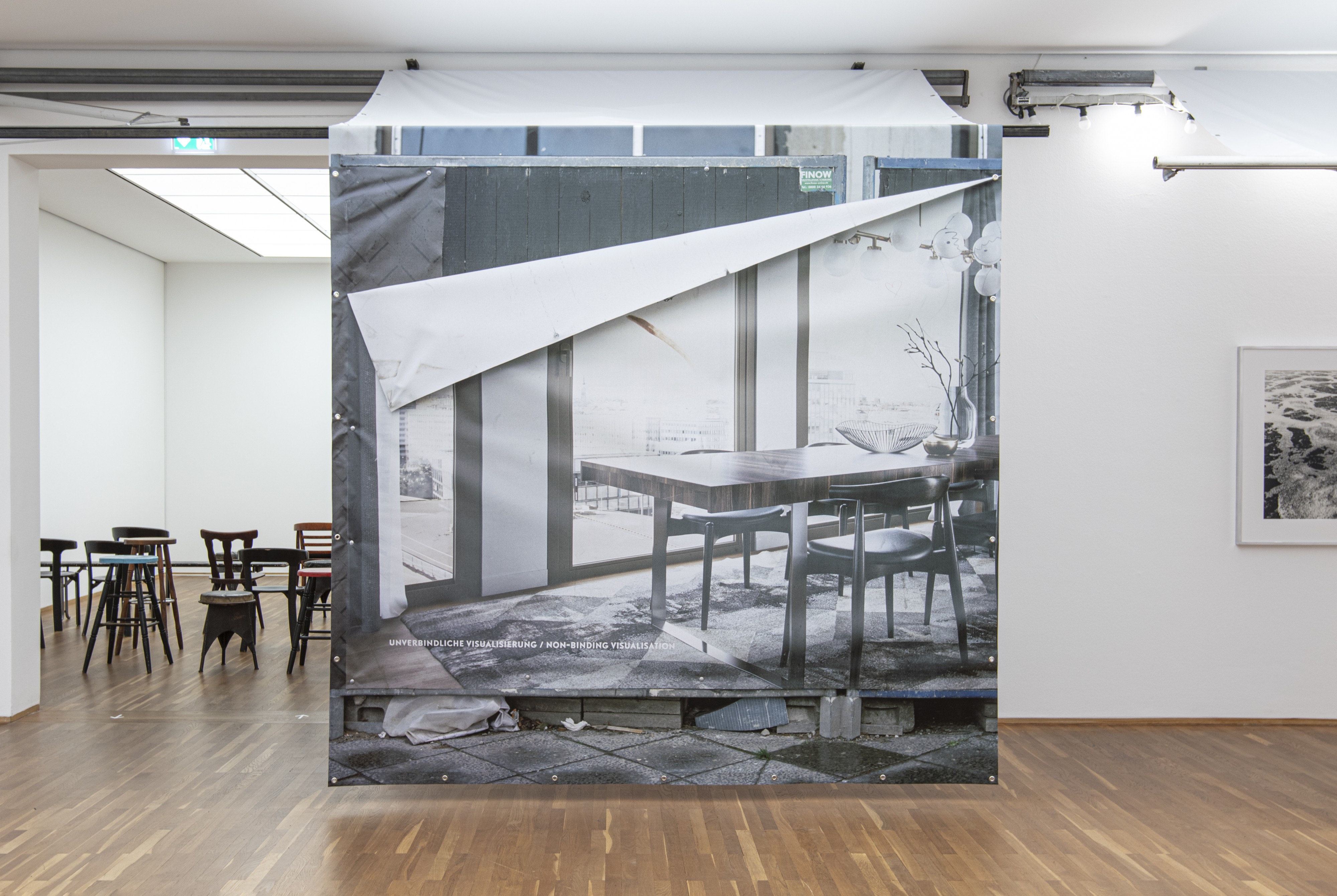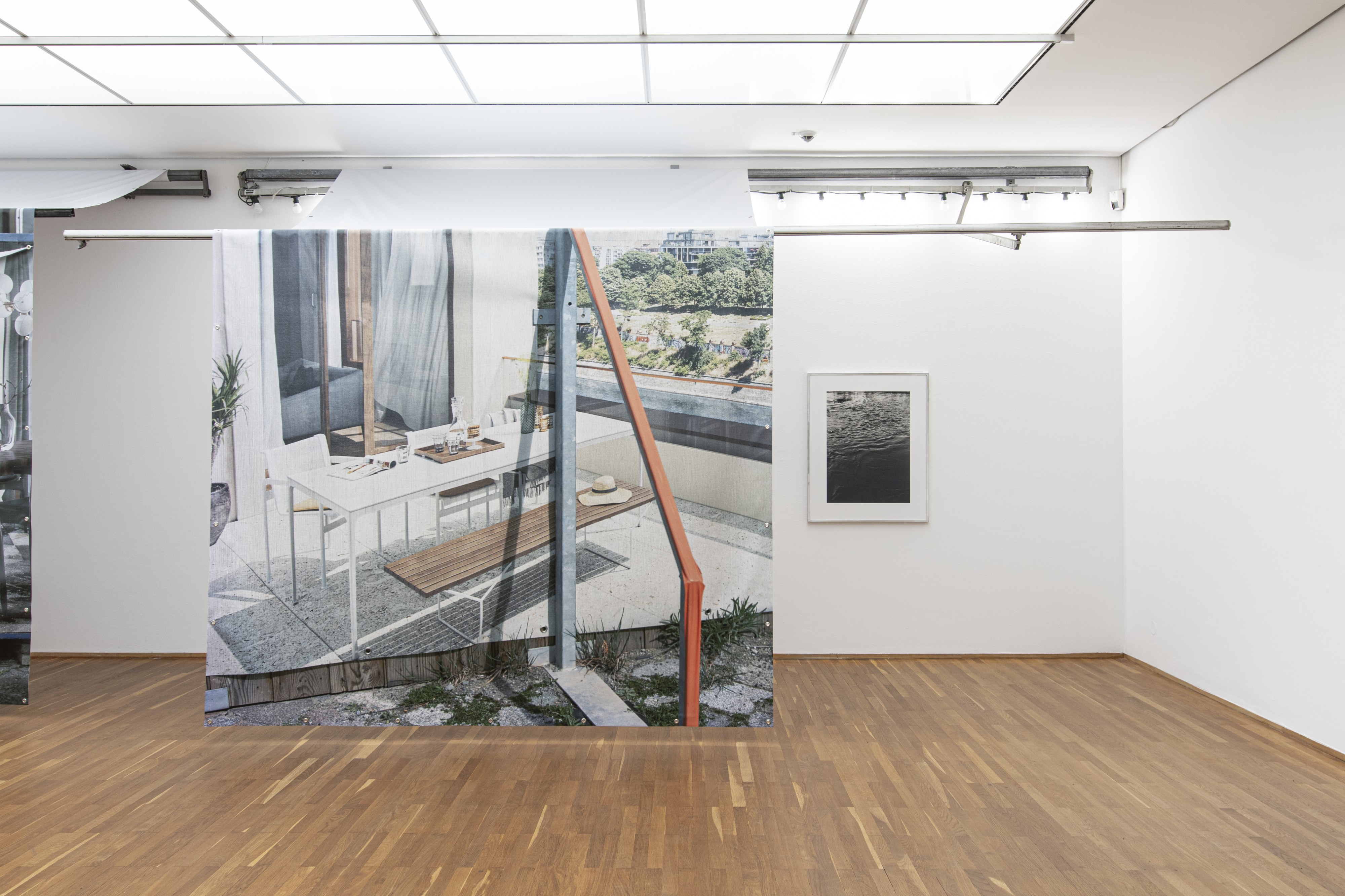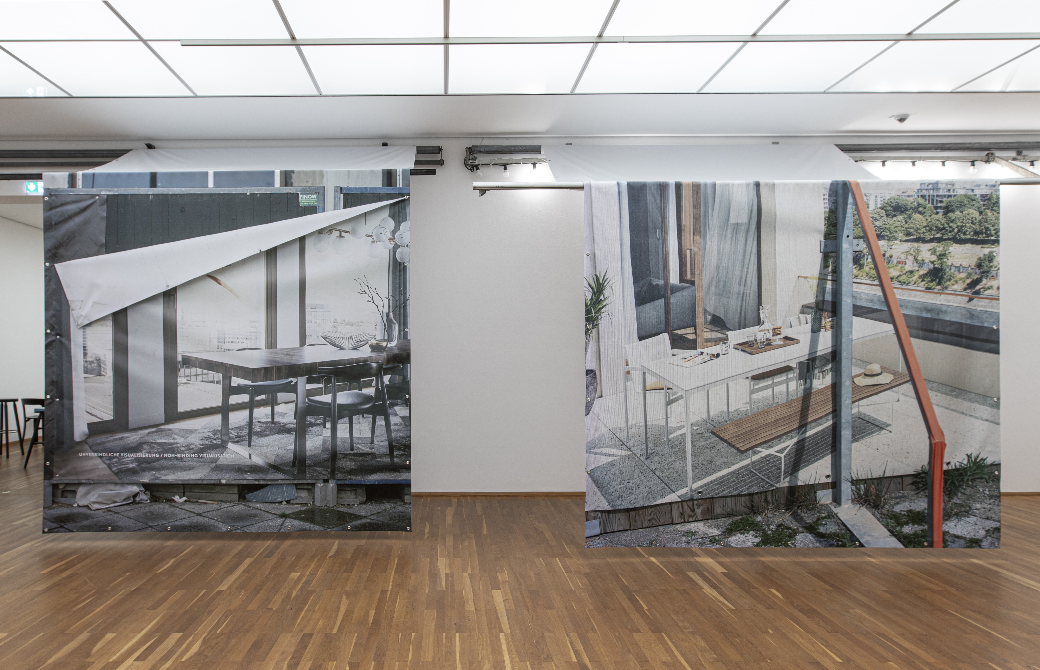At Hamburger Bahnhof, Henkel and Pitegoff are showing two series of photographs. For Exteriors, the duo have photographed banners at real estate development projects around the city, including the developments directly behind the Hamburger While only the trailer is on view at Hamburger Bahnhof. These digital renderings present an ideal- ized and purified vision of city living, appealing to an elite audience of socially-mobile urbanites and investors. Yet the photographs taken by Henkel and Pitegoff embed these utopian projections in the gritty reality of the city, contrasting the clean im- ages with the dirt and disorder of the construction sites which frame them. Printed on PVC banners, the photographic works appropriate the mode of presentation used as a marketing tool at the sites and offer a critical gaze on current models of urban planning in Berlin, which are proposed primarily by private entities with commercial interests. The banners are attached to the stripped skeletons of awnings collected from recently closed bars and restaurants. Behind Exteriors hangs a new series of photographs depicting the unseen and marginalized reality of the city, in this case the municipal sewage works at Ruhleben. The series, titled Col- lective Image 1-12 , transforms the cities waste into sparkling images of water which suggest close-up shots of the ocean, in others the artificial maelstroms betray the unsanitary truth.