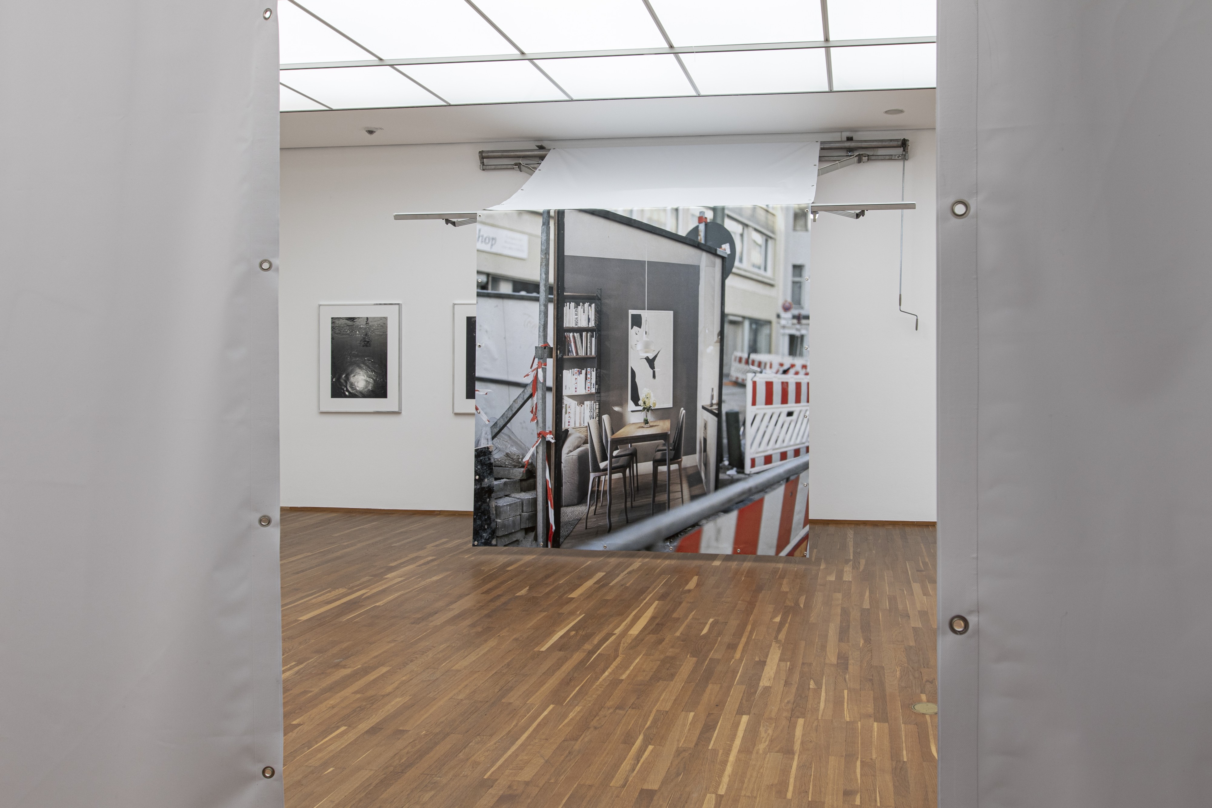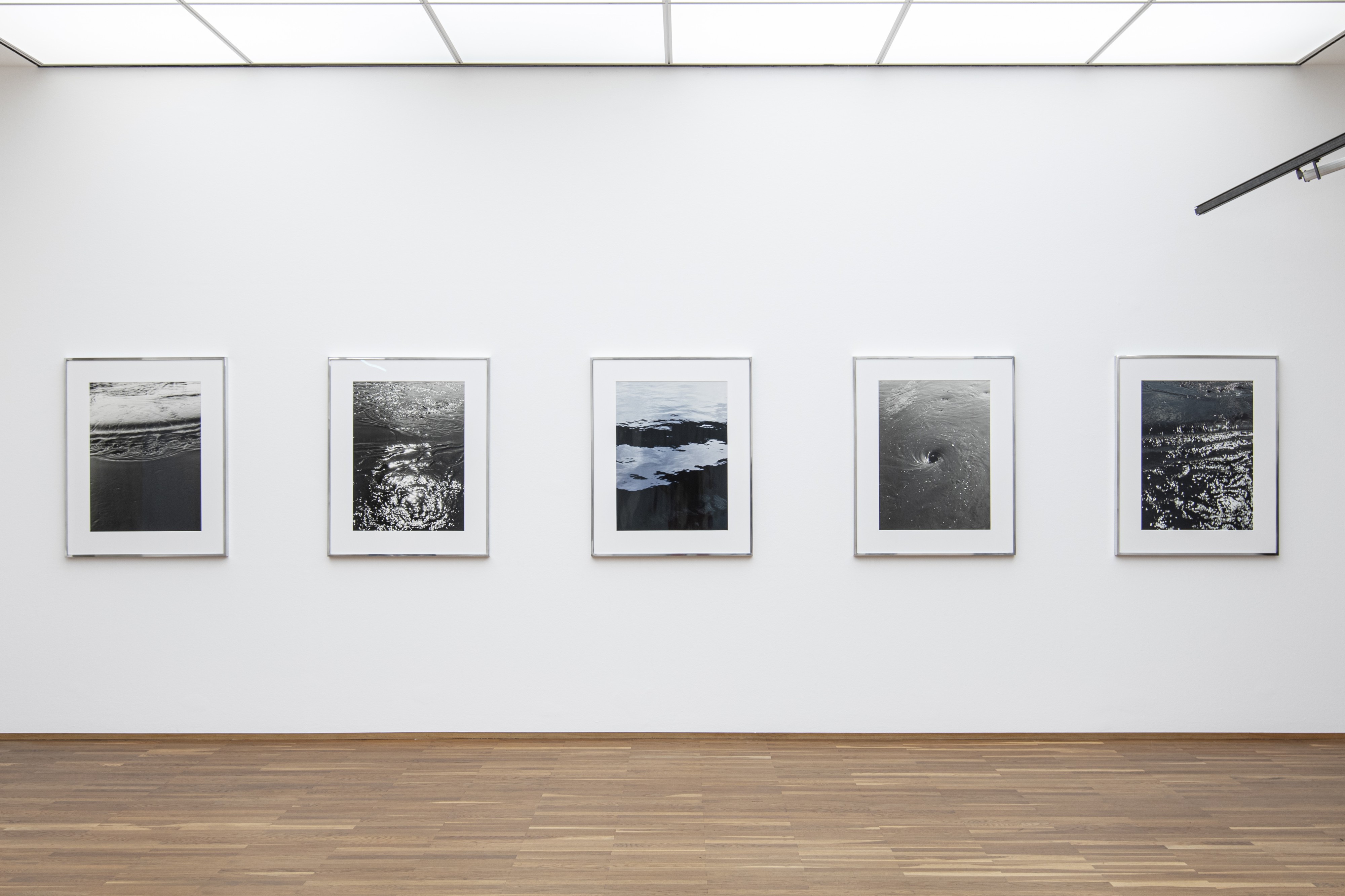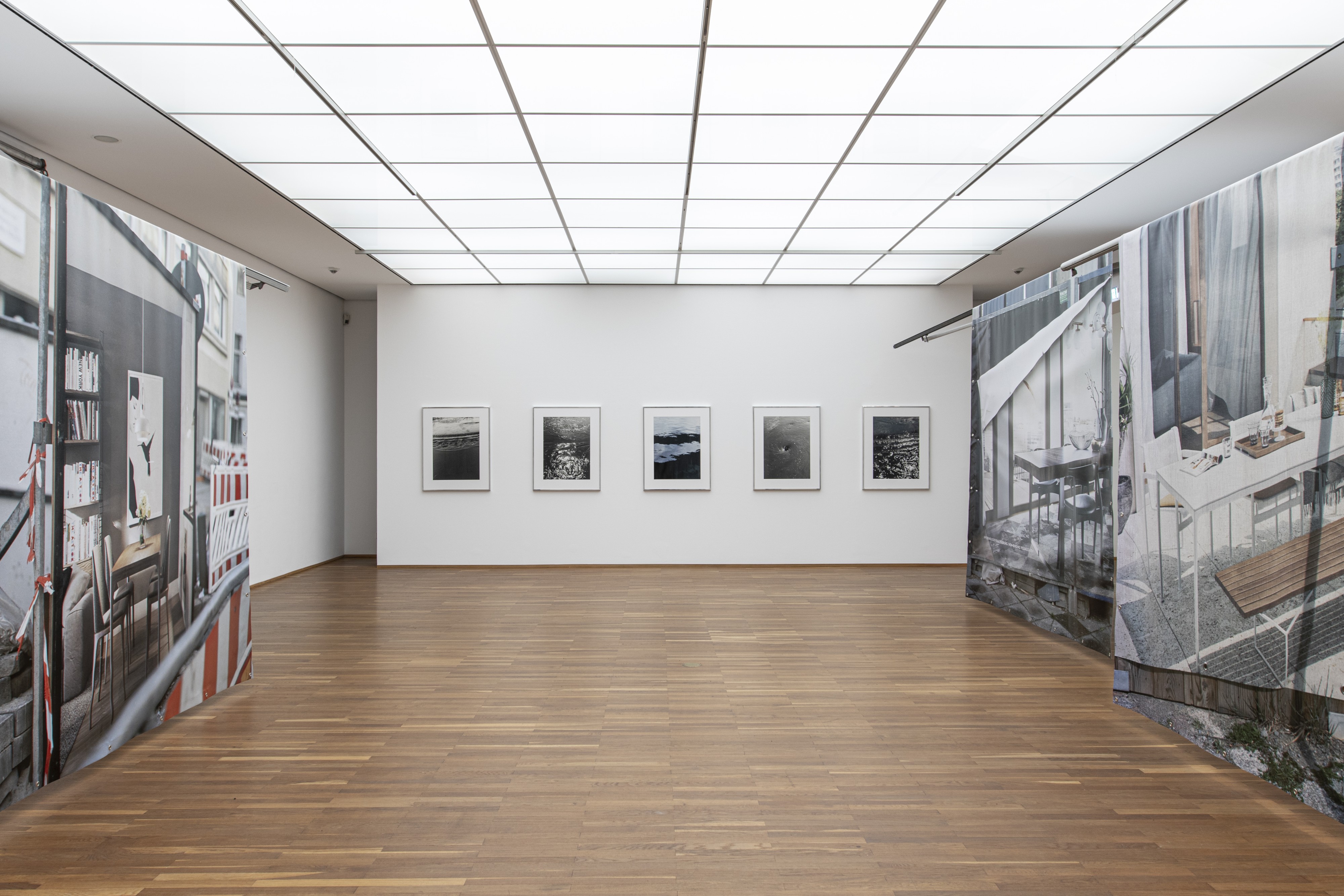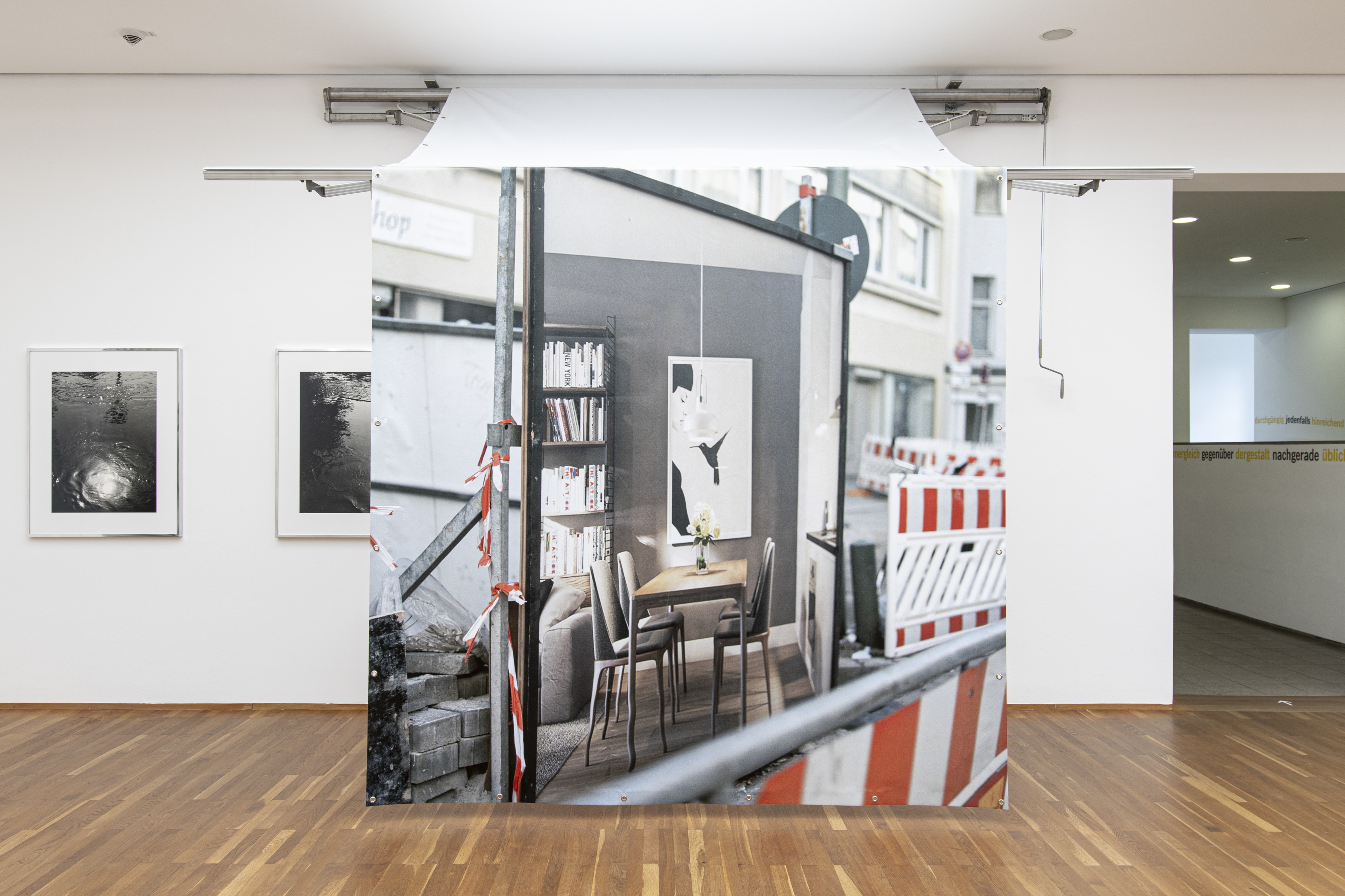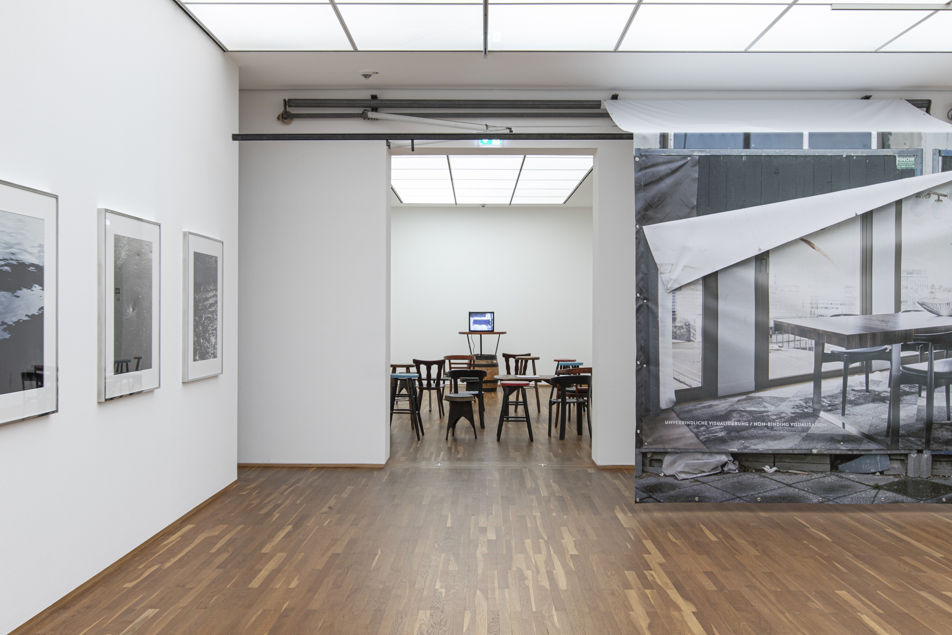 At Hamburger Bahnhof, Henkel and Pitegoff are showing two series of photographs. For Exteriors, the duo have photographed banners at real estate development projects around the city, including the developments directly behind the Hamburger While only the trailer is on view at Hamburger Bahnhof. These digital renderings present an ideal- ized and purified vision of city living, appealing to an elite audience of socially-mobile urbanites and investors. Yet the photographs taken by Henkel and Pitegoff embed these utopian projections in the gritty reality of the city, contrasting the clean im- ages with the dirt and disorder of the construction sites which frame them. Printed on PVC banners, the photographic works appropriate the mode of presentation used as a marketing tool at the sites and offer a critical gaze on current models of urban planning in Berlin, which are proposed primarily by private entities with commercial interests. The banners are attached to the stripped skeletons of awnings collected from recently closed bars and restaurants. Behind Exteriors hangs a new series of photographs depicting the unseen and marginalized reality of the city, in this case the municipal sewage works at Ruhleben. The series, titled Col- lective Image 1-12 , transforms the cities waste into sparkling images of water which suggest close-up shots of the ocean, in others the artificial maelstroms betray the unsanitary truth.