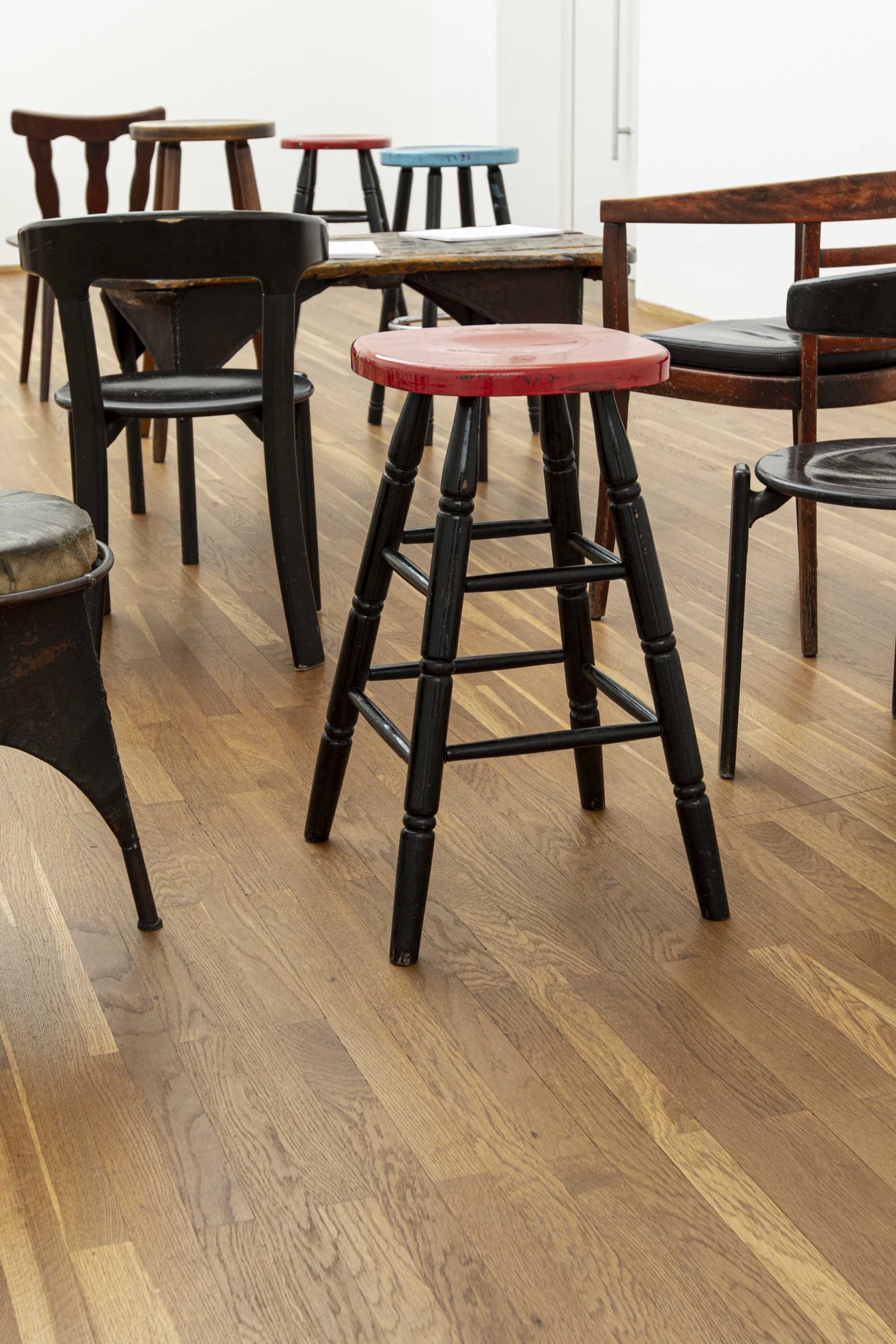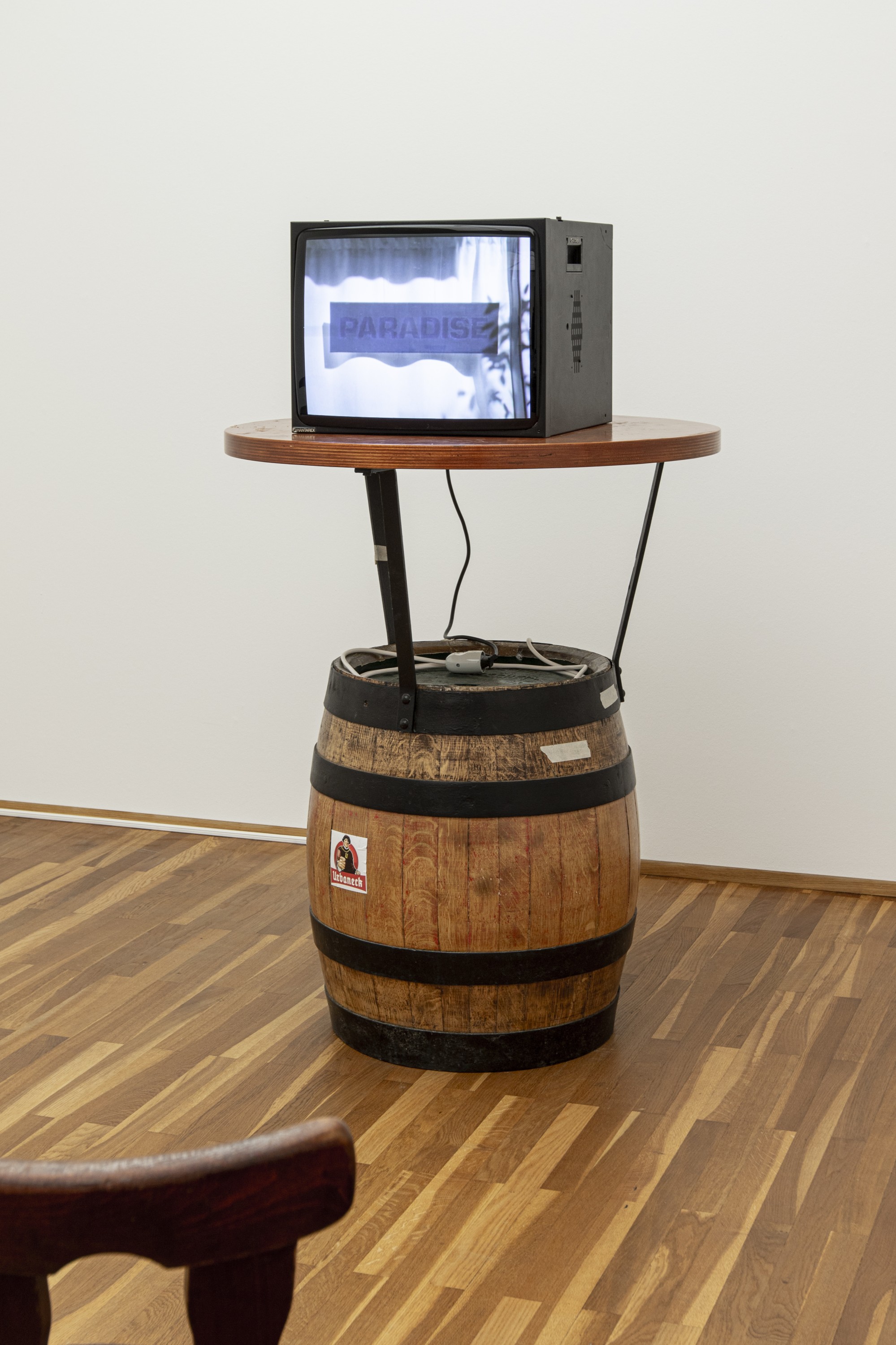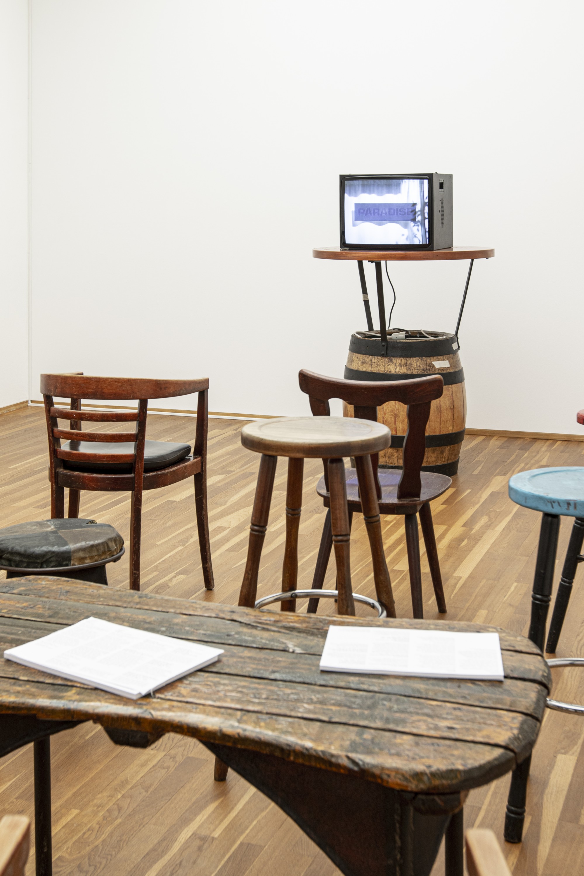 In the second room, visitors can watch a trailer for the first two episodes of the ongoing TV series Paradise, which Henkel and Pitegoff film on 16mm at their bar in Potsdamer Straße. The series casts em- ployees and regular visitors in new roles to create a fictional narrative around the bar. Paradise, set in 2023, follows the bar’s employees as they walk the foggy line between service and performance. While only the trailer is on view at Hamburger Bahnhof, the two episodes can be seen at a variety of bars and off-spaces around the city. The series is silent, thus borrowing its soundtrack from the ambient noise of the spaces where it is shown. In order to transplant a trace of this network of paral- lel realities into the museum environment, Henkel and Pitegoff have borrowed furniture from each location to occupy the exhibition space. In return, furniture from the Hamburger Bahnhof has been sent to the satellite spaces and also to TV Bar.