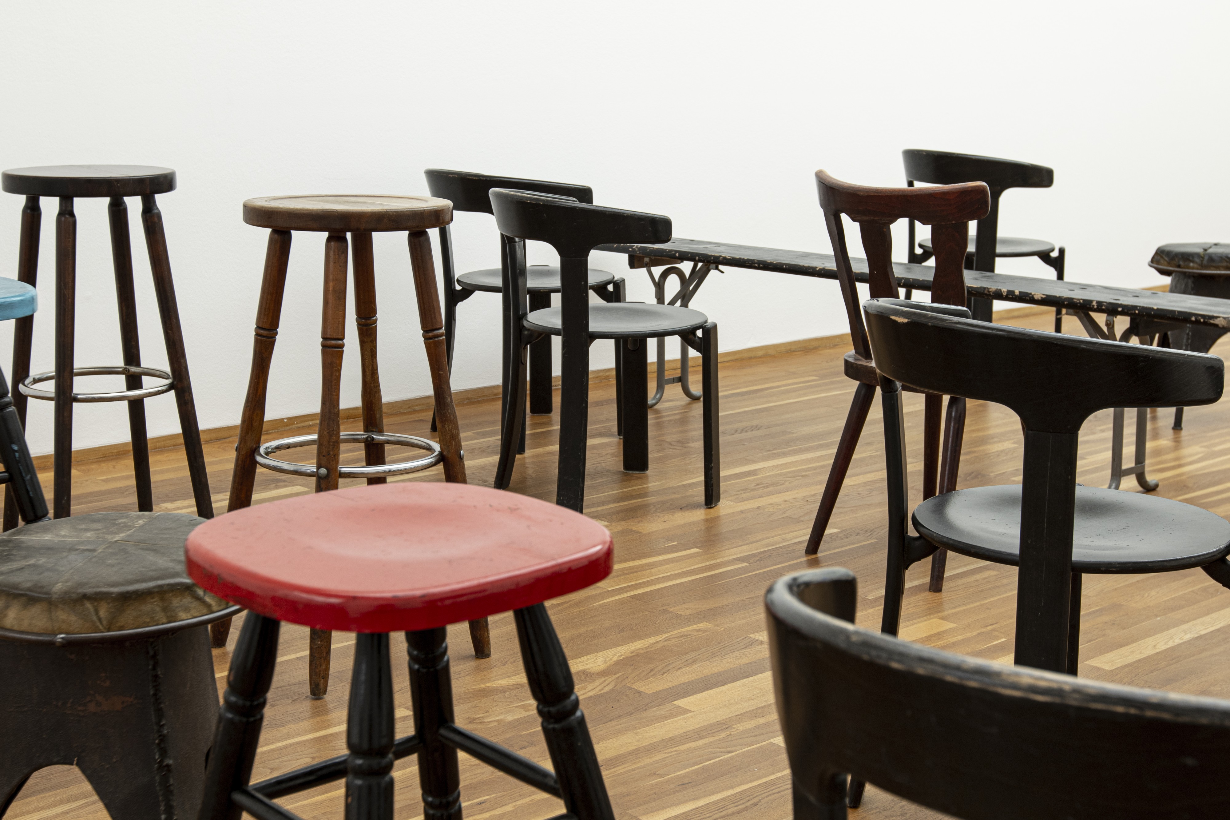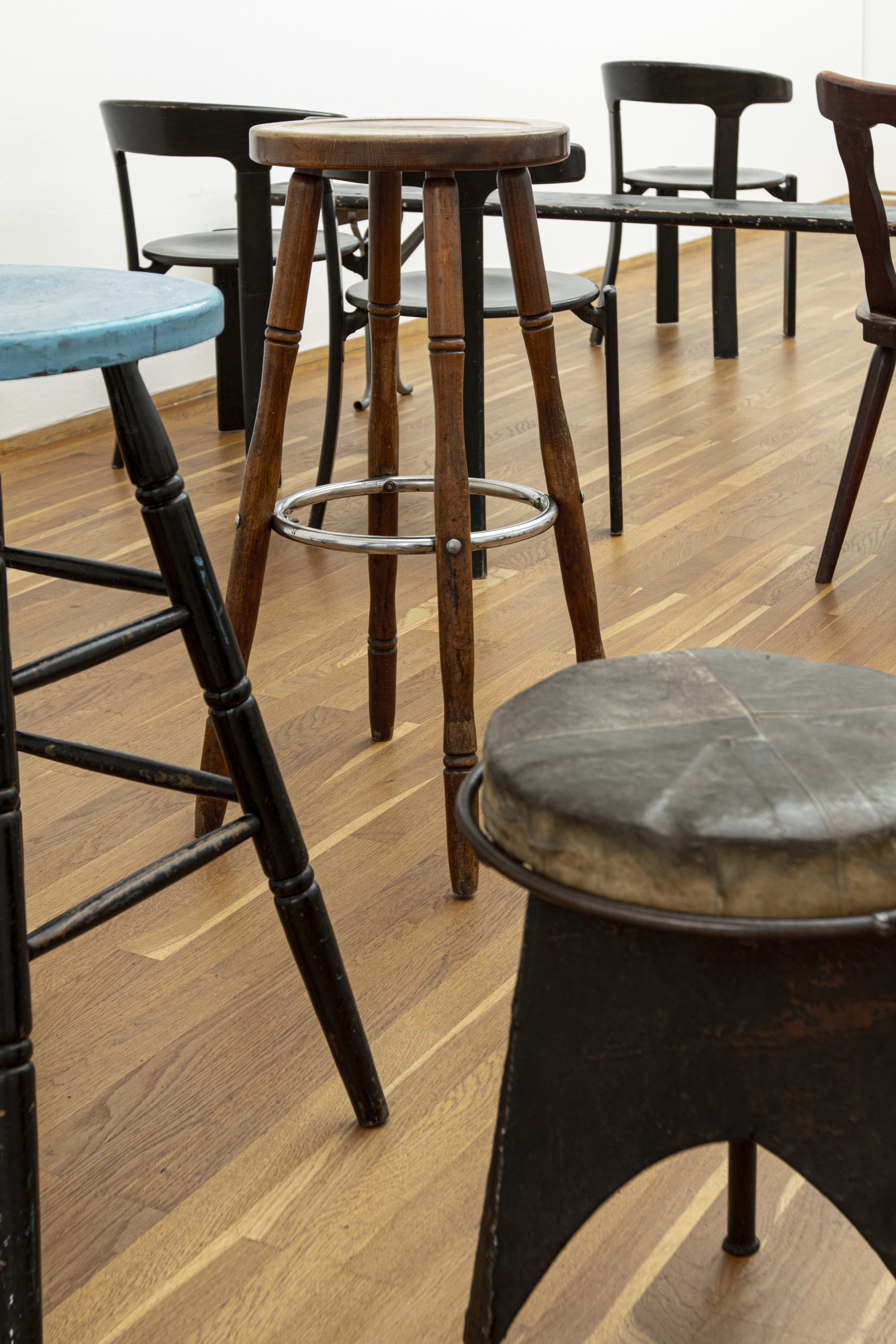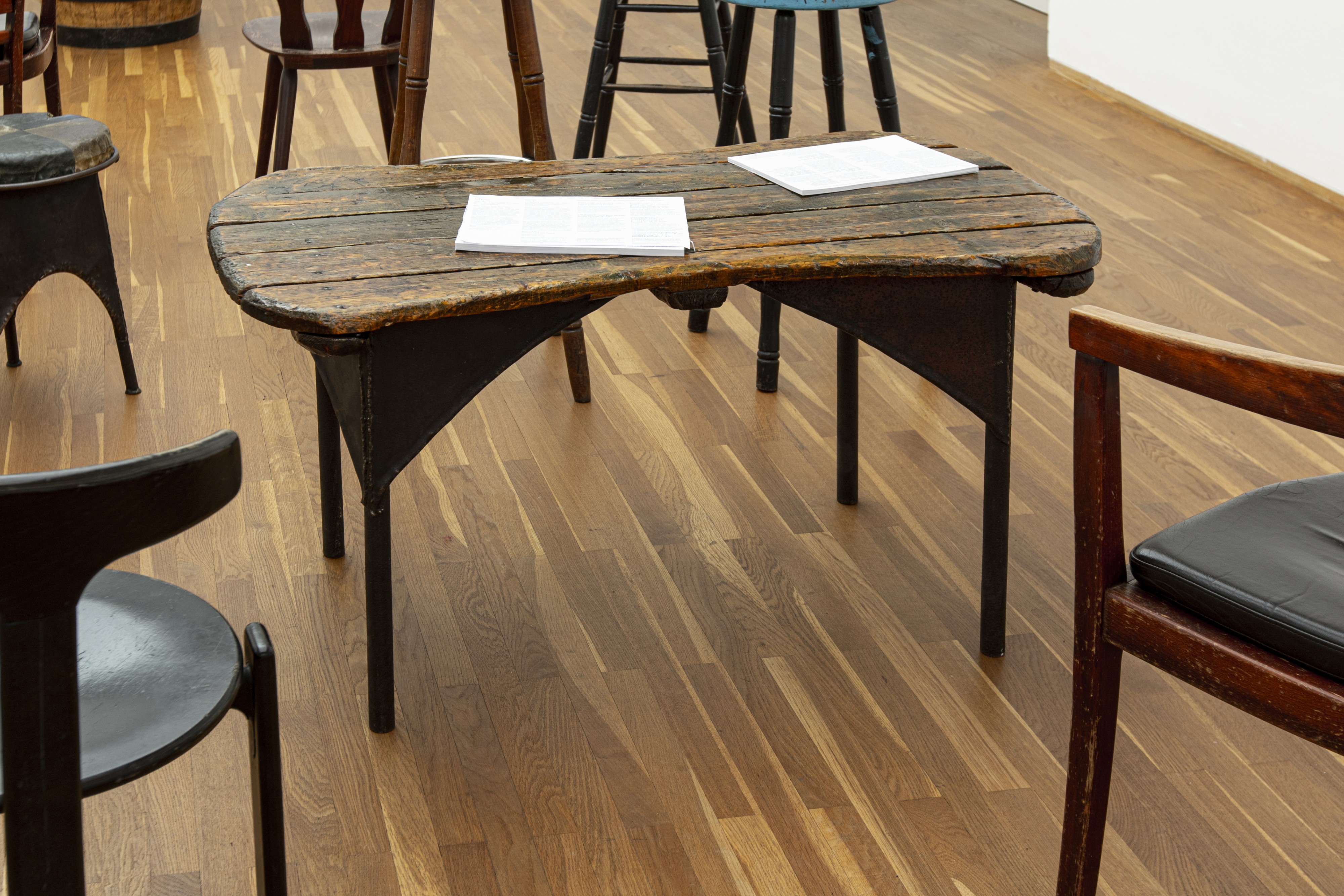 In the second room, visitors can watch a trailer for the first two episodes of the ongoing TV series Paradise, which Henkel and Pitegoff film on 16mm at their bar in Potsdamer Straße. The series casts em- ployees and regular visitors in new roles to create a fictional narrative around the bar. Paradise, set in 2023, follows the bar’s employees as they walk the foggy line between service and performance. While only the trailer is on view at Hamburger Bahnhof, the two episodes can be seen at a variety of bars and off-spaces around the city. The series is silent, thus borrowing its soundtrack from the ambient noise of the spaces where it is shown. In order to transplant a trace of this network of paral- lel realities into the museum environment, Henkel and Pitegoff have borrowed furniture from each location to occupy the exhibition space. In return, furniture from the Hamburger Bahnhof has been sent to the satellite spaces and also to TV Bar.