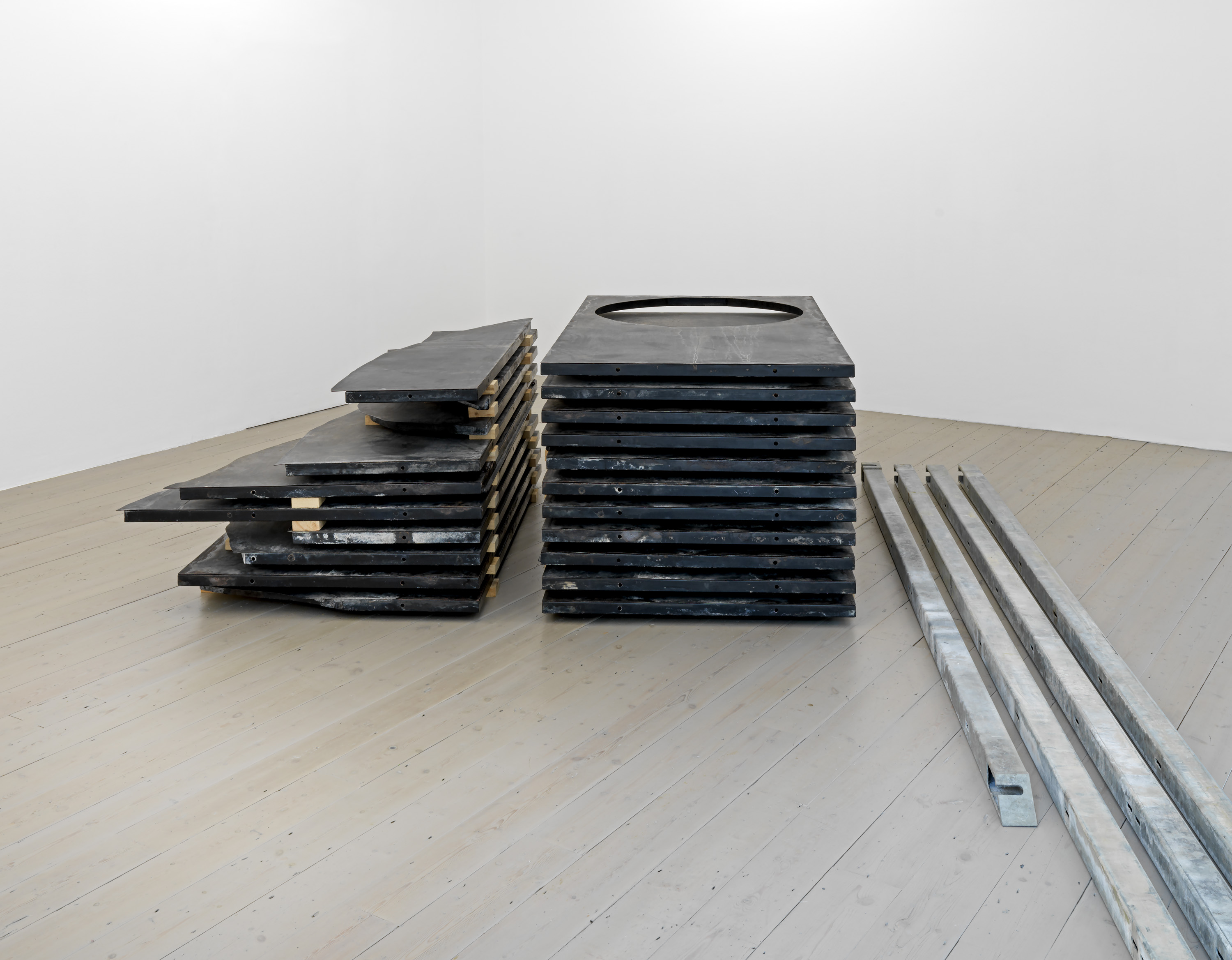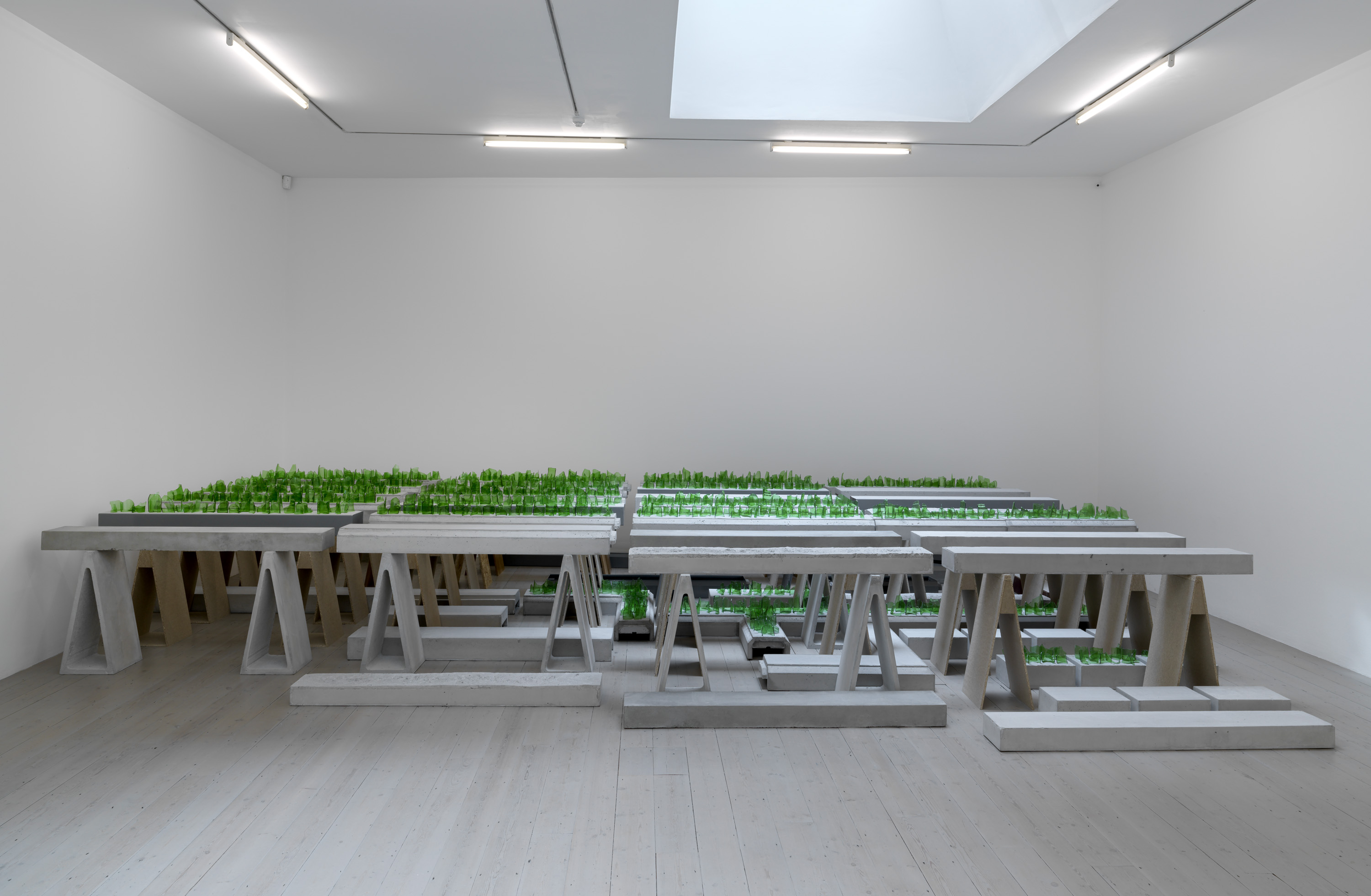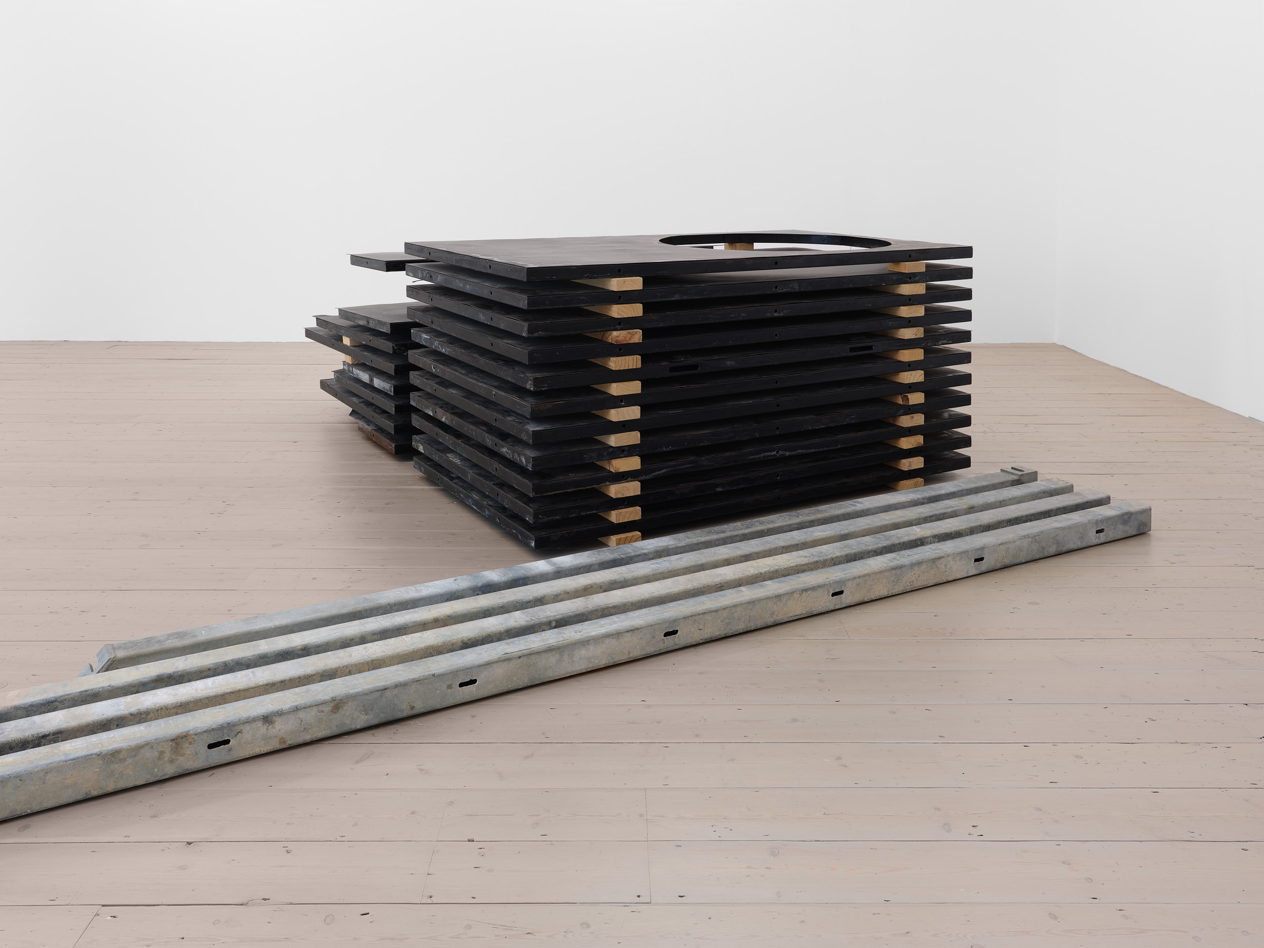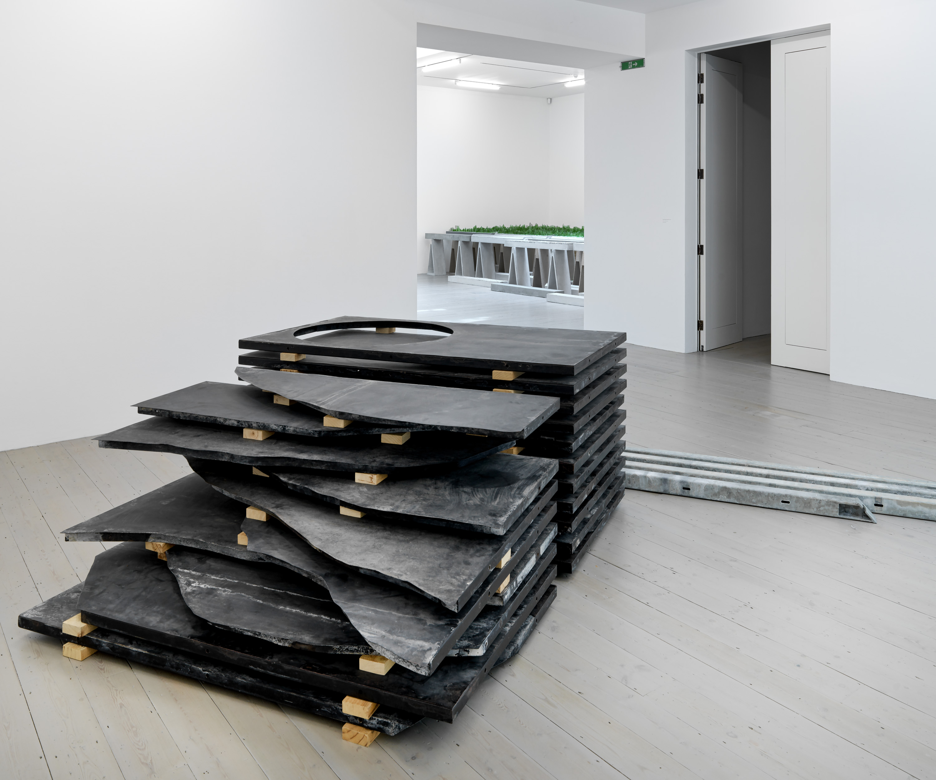 Although ultimately these forms are indeterminate, open to interpretation by a curious observer, much of Aranberri’s work reflects on modernity’s failure to subordinate or impose order on the natural environment (he grew up in Basque Country during the Franco dictatorship, when its landscape and mountains became emancipatory symbols). Many of the sculptural works in the exhibition imagine transient material culture as subject to geological time, sedimented into archaeological forms.