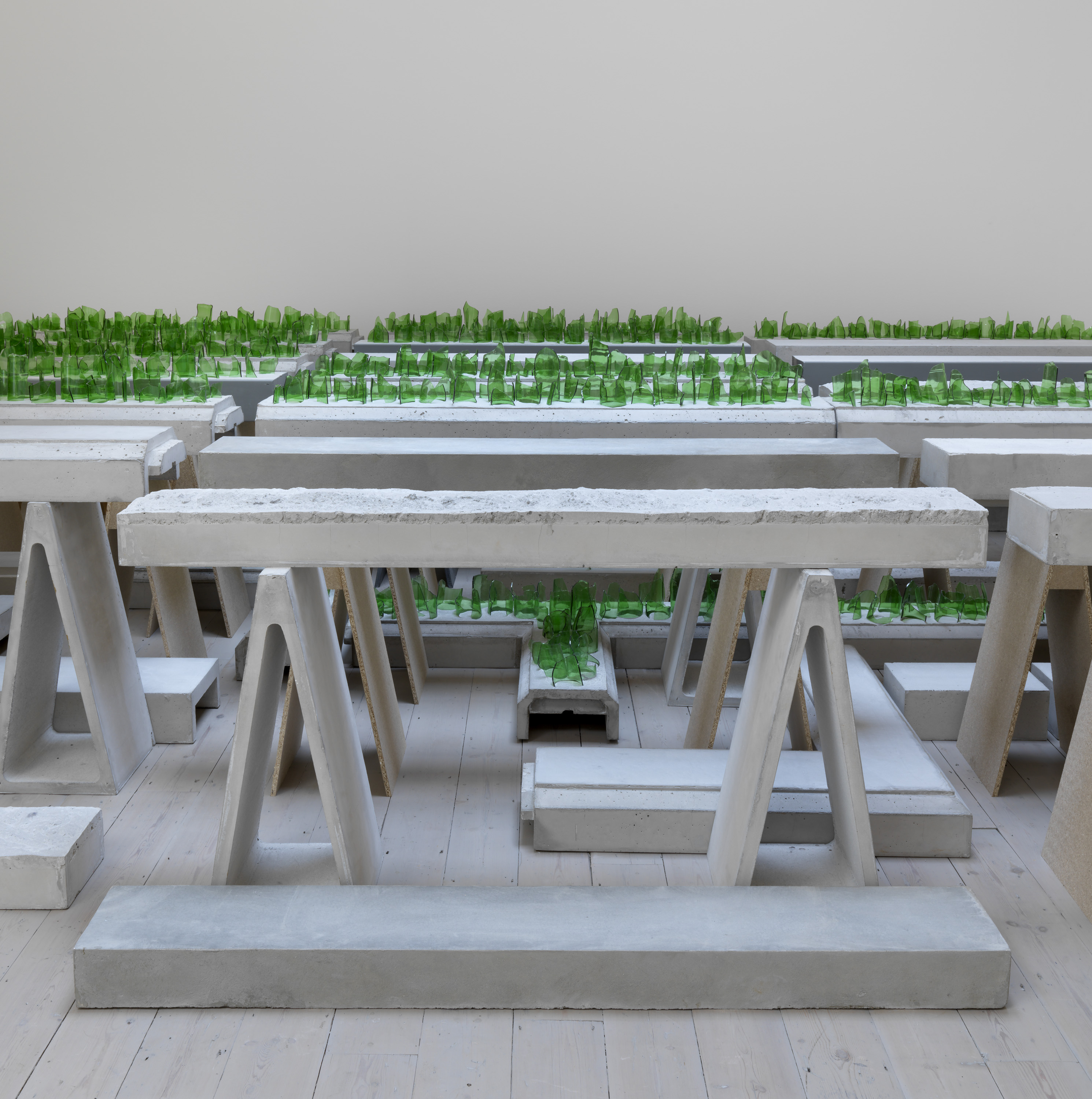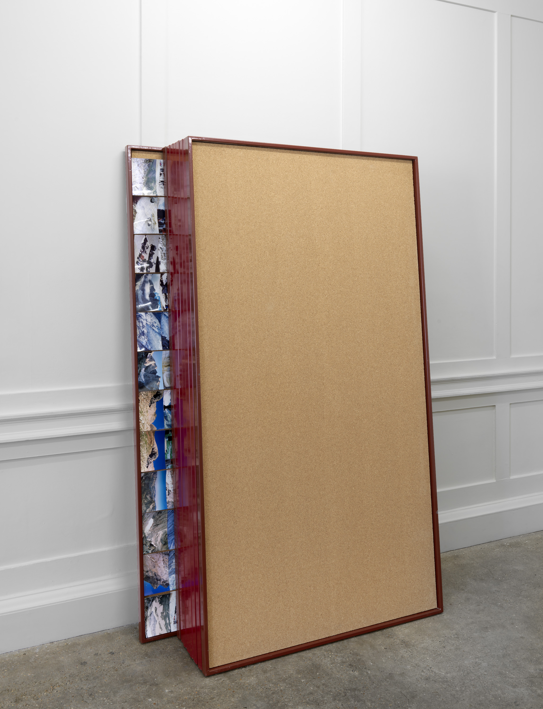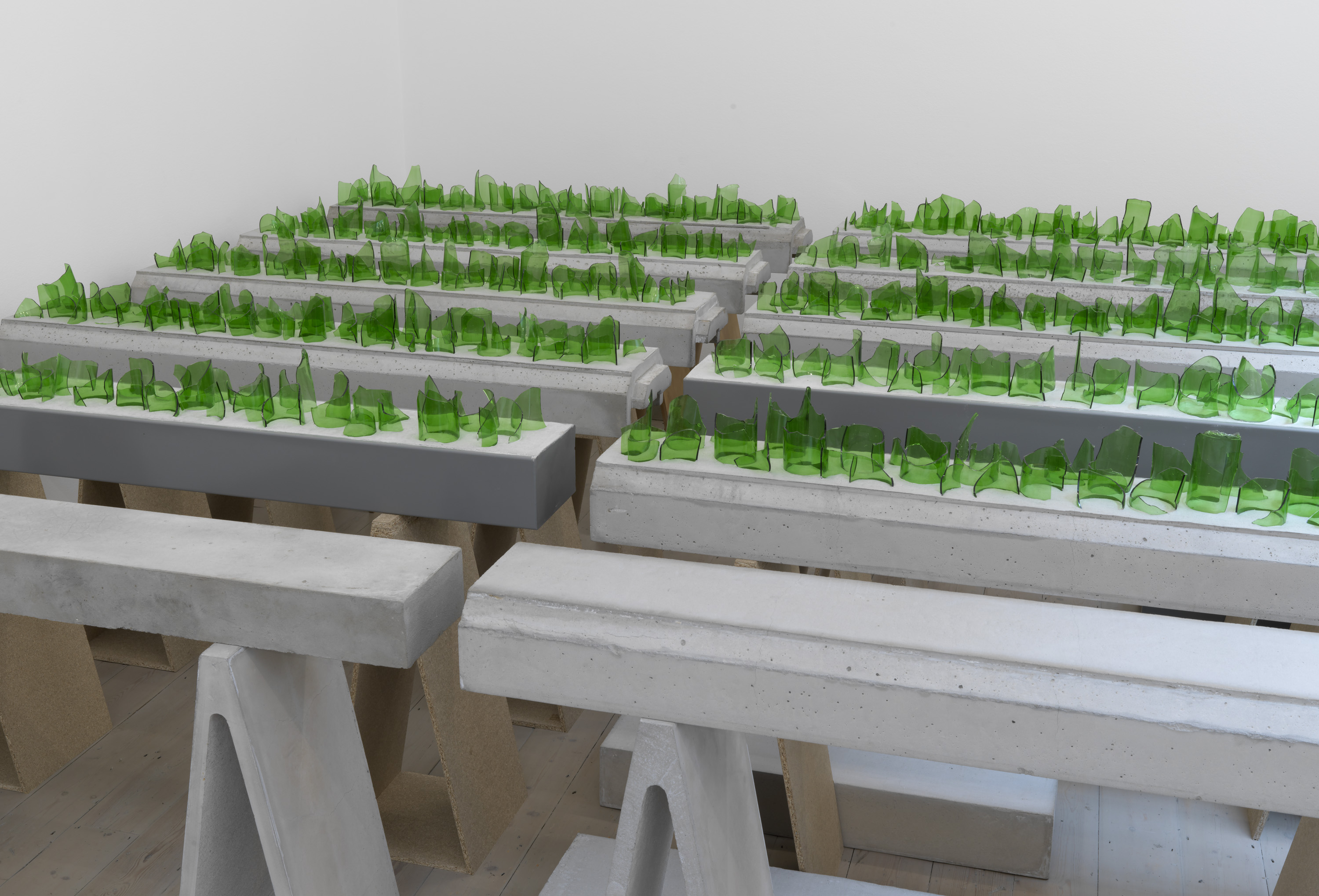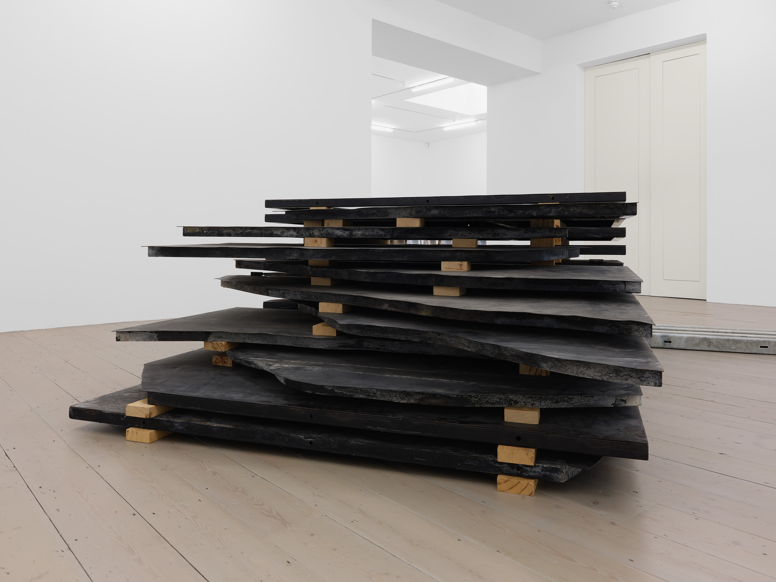 Although ultimately these forms are indeterminate, open to interpretation by a curious observer, much of Aranberri’s work reflects on modernity’s failure to subordinate or impose order on the natural environment (he grew up in Basque Country during the Franco dictatorship, when its landscape and mountains became emancipatory symbols). Many of the sculptural works in the exhibition imagine transient material culture as subject to geological time, sedimented into archaeological forms.