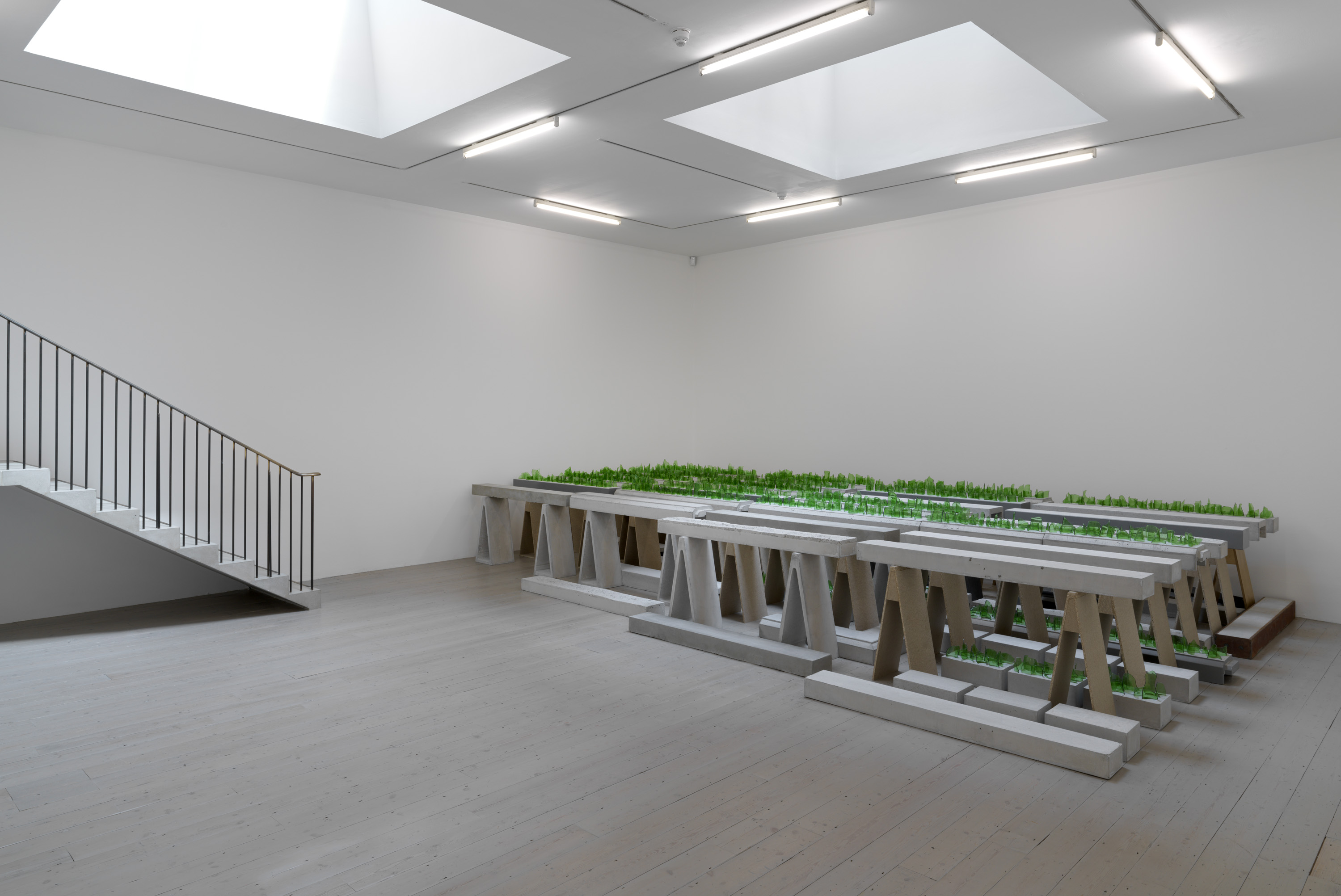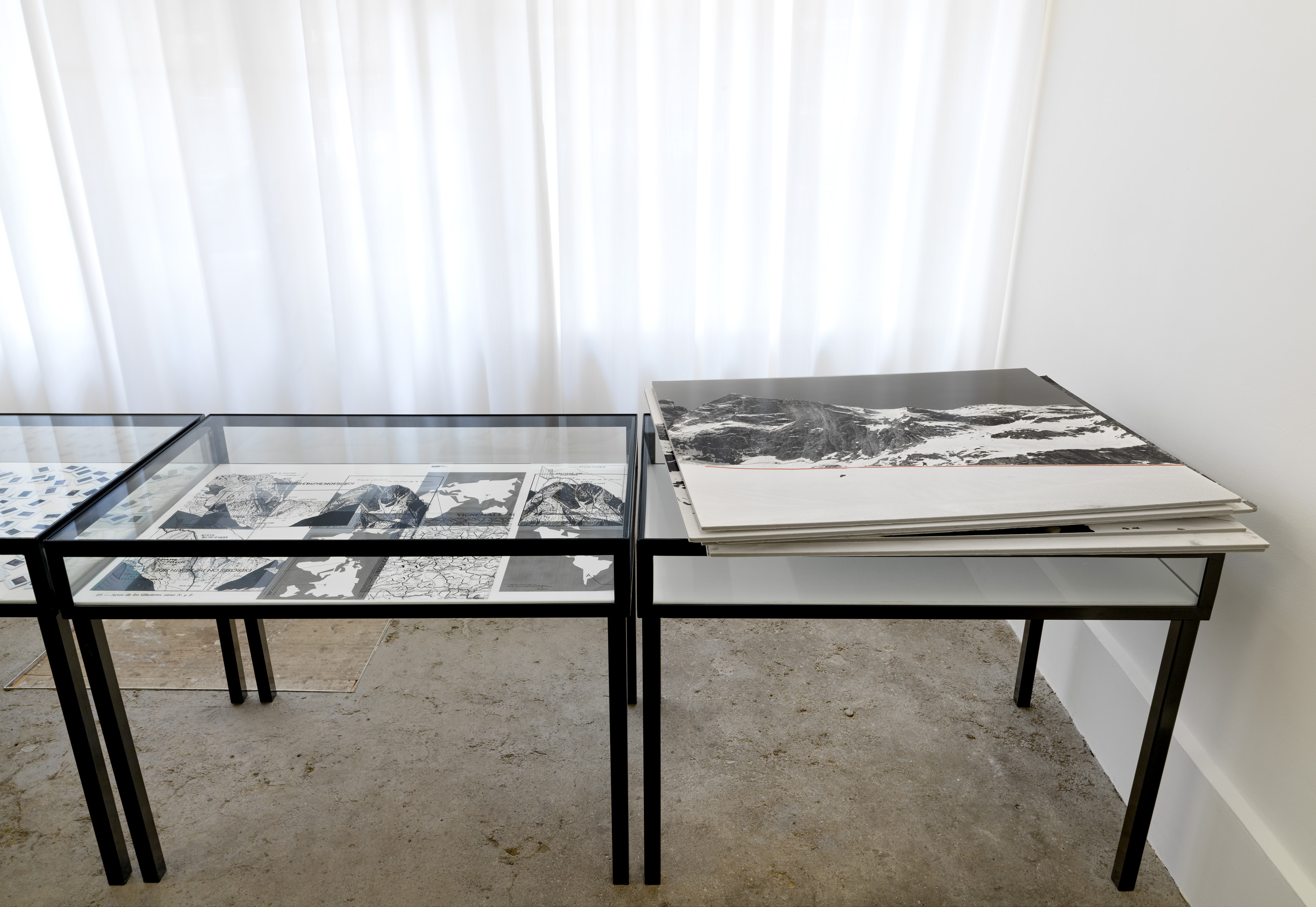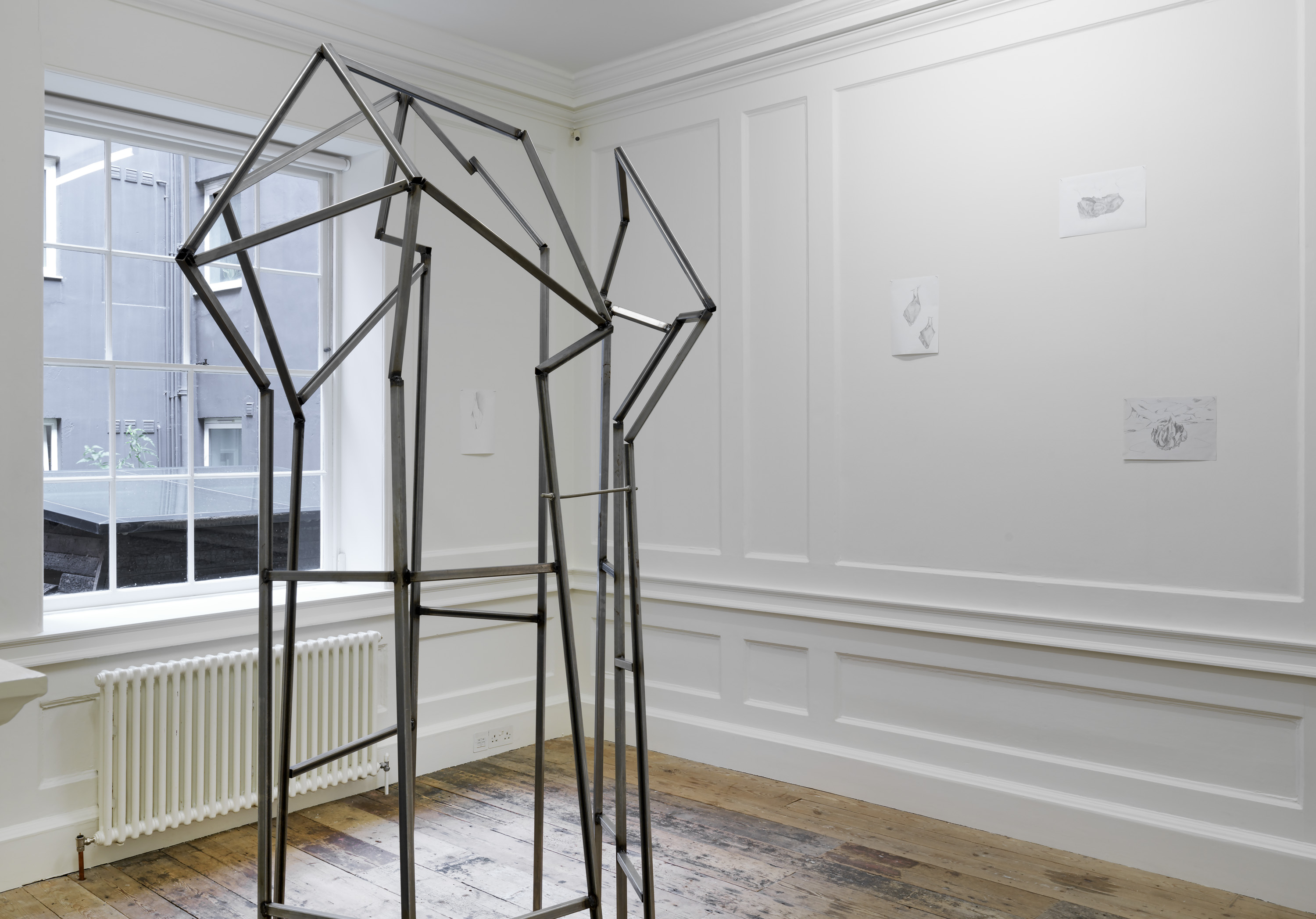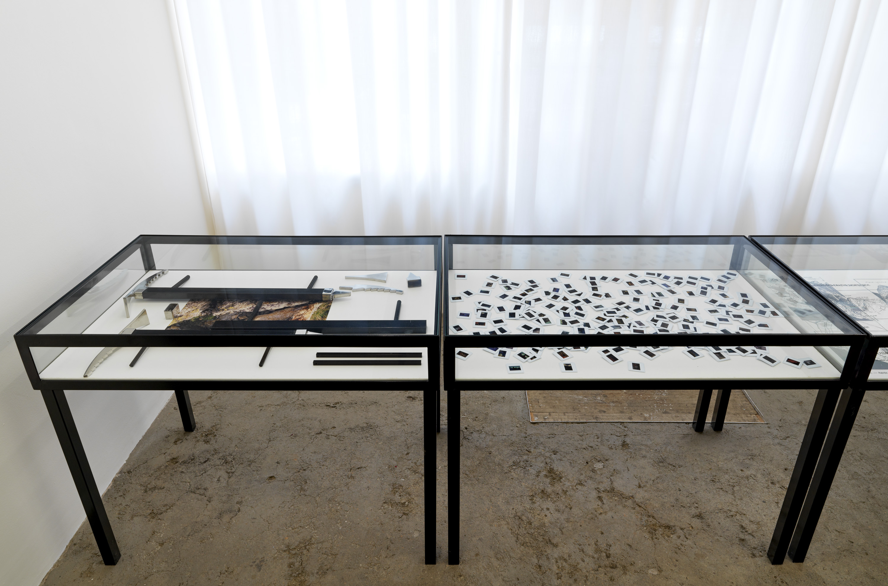 The installation in gallery 1 appears like a display in a geographical society, recounting the uncertain outcome of a mountaineering expedition. The central gallery has become a landscape of smashed glass, as if returning urban forms of makeshift security and luxury wellness to nature. The origins of the sculptural work in the far gallery lie in Aranberri’s construction twenty years ago of a cave wall and habitat for bats, while the role of the artist in the unpicking of histories is suggested in the stripped-back statues on the first floor. Throughout, Aranberri uses uncaptioned photographs and drawings, as well as steel sections, selected or made for this exhibition as commentaries and footnotes on its itinerary.