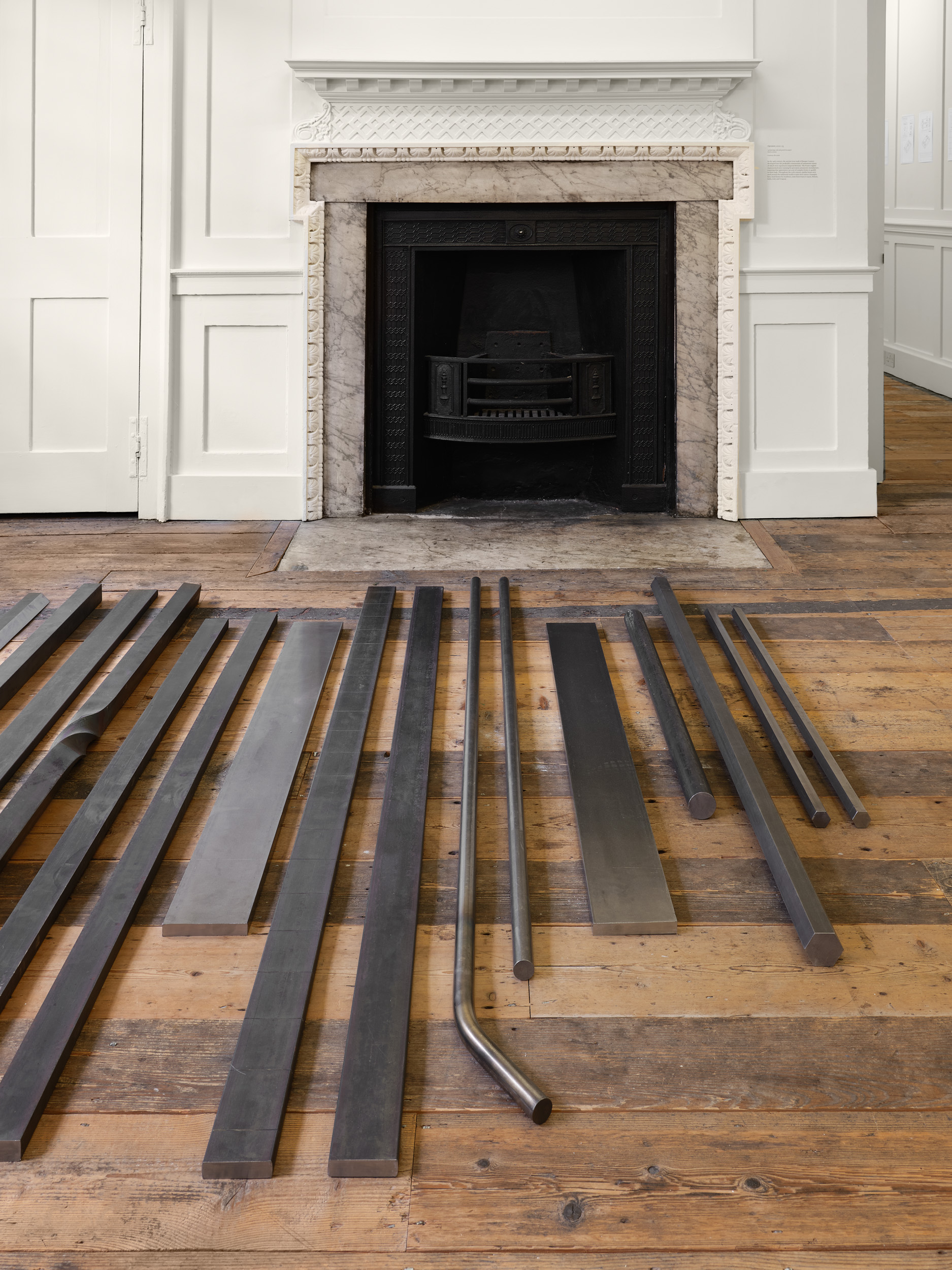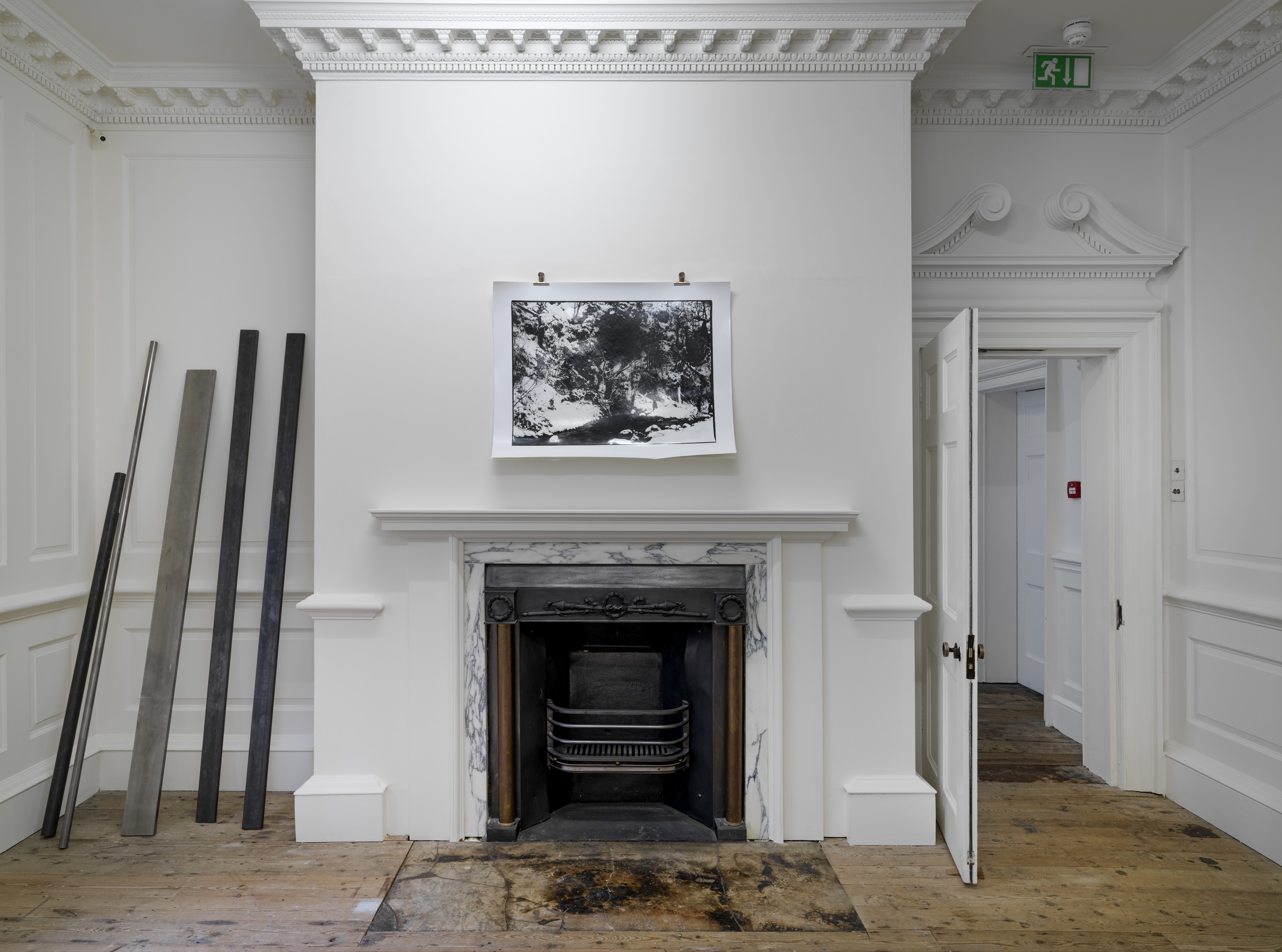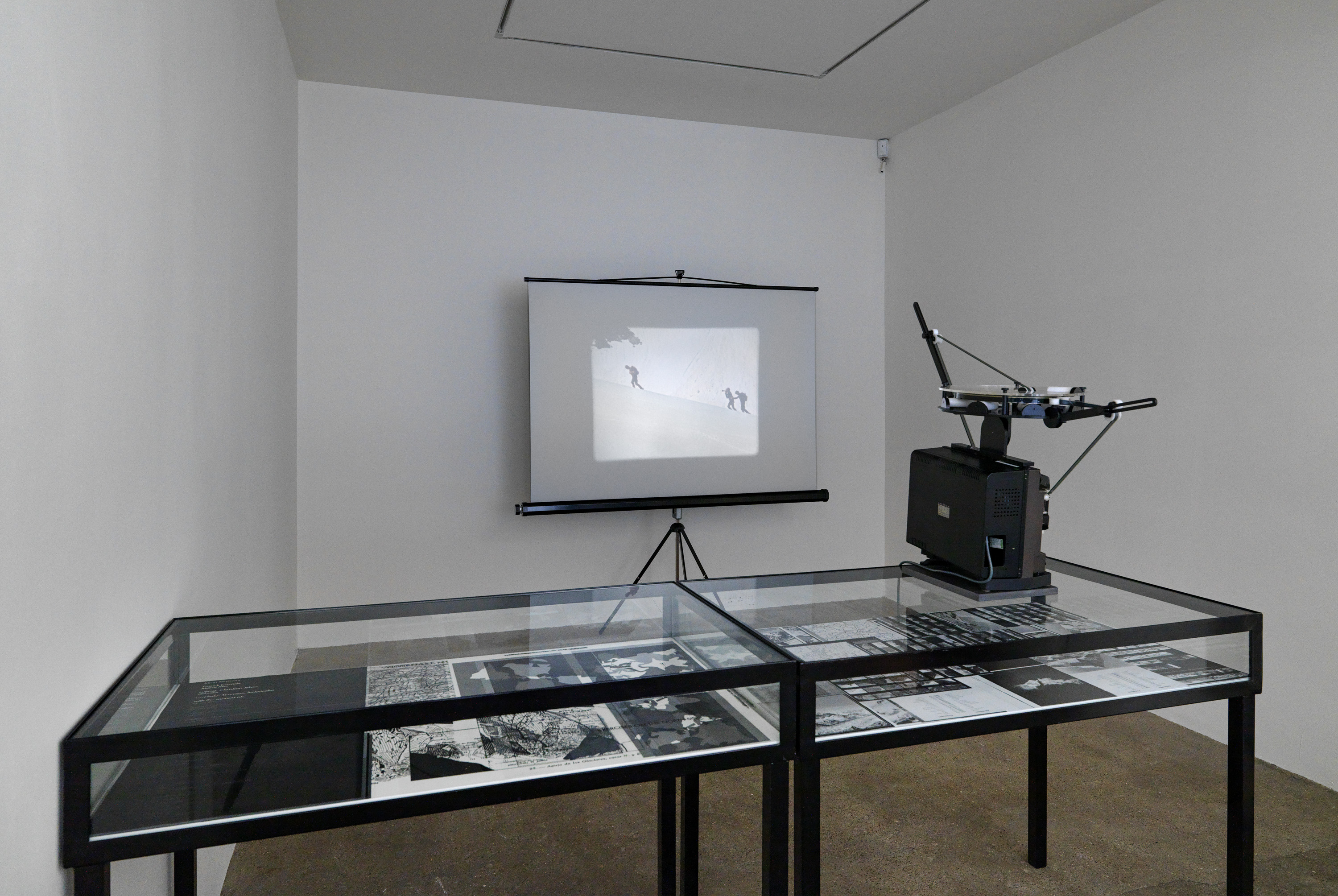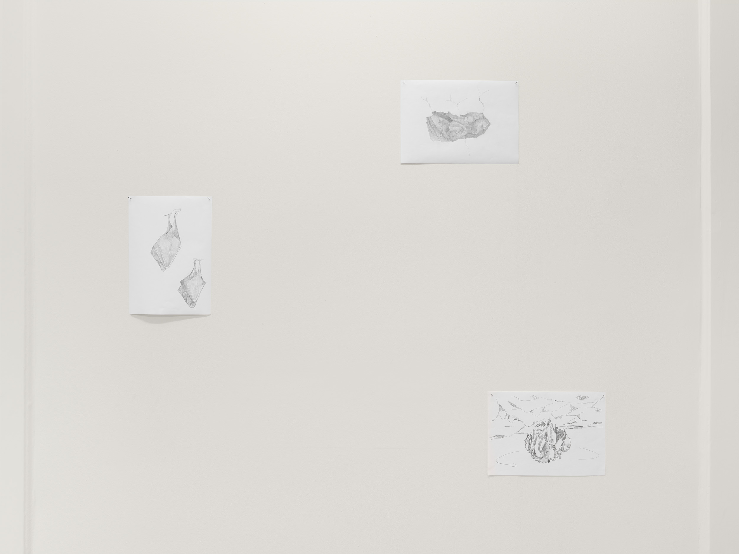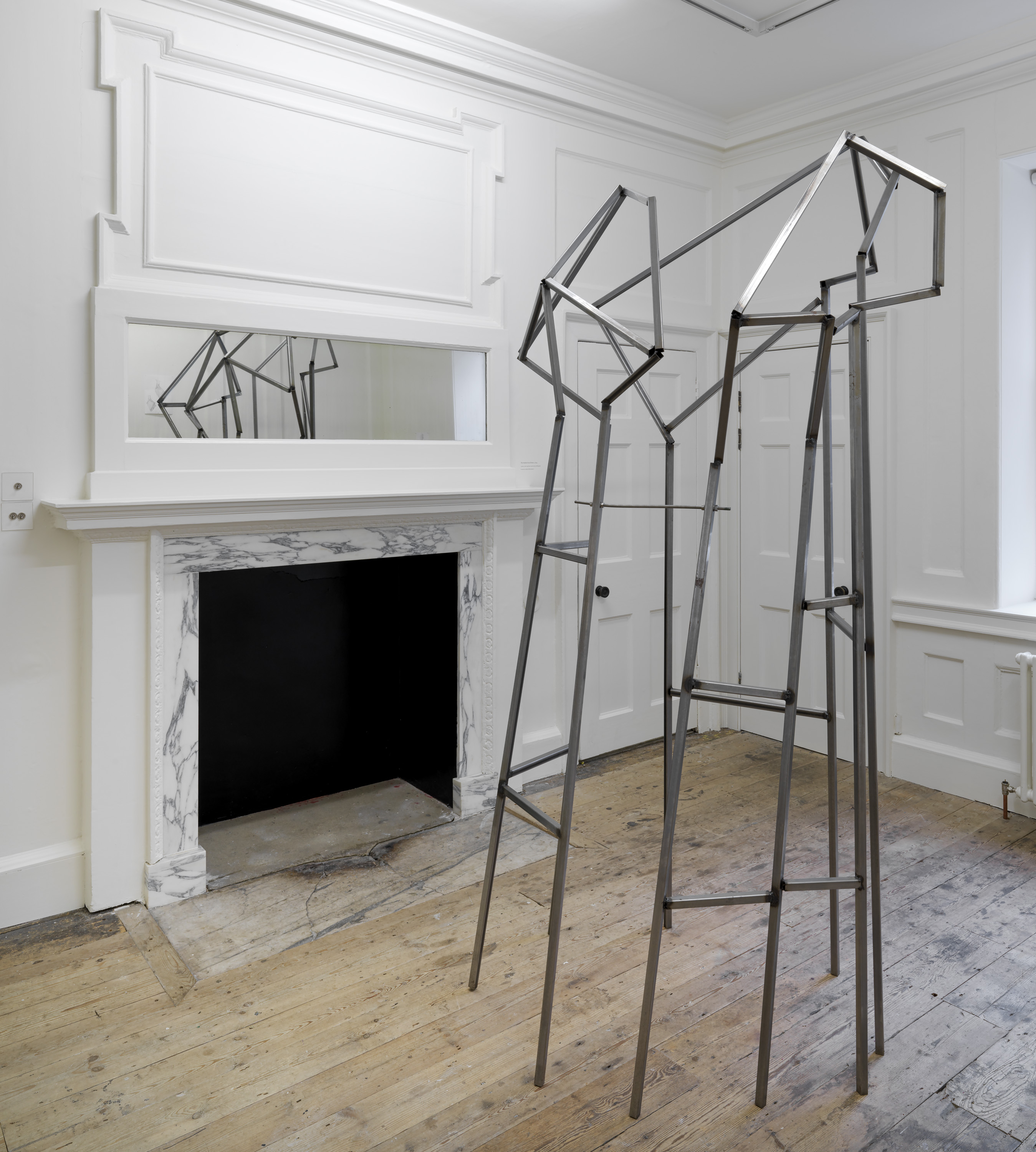 The installation in gallery 1 appears like a display in a geographical society, recounting the uncertain outcome of a mountaineering expedition. The central gallery has become a landscape of smashed glass, as if returning urban forms of makeshift security and luxury wellness to nature. The origins of the sculptural work in the far gallery lie in Aranberri’s construction twenty years ago of a cave wall and habitat for bats, while the role of the artist in the unpicking of histories is suggested in the stripped-back statues on the first floor. Throughout, Aranberri uses uncaptioned photographs and drawings, as well as steel sections, selected or made for this exhibition as commentaries and footnotes on its itinerary.